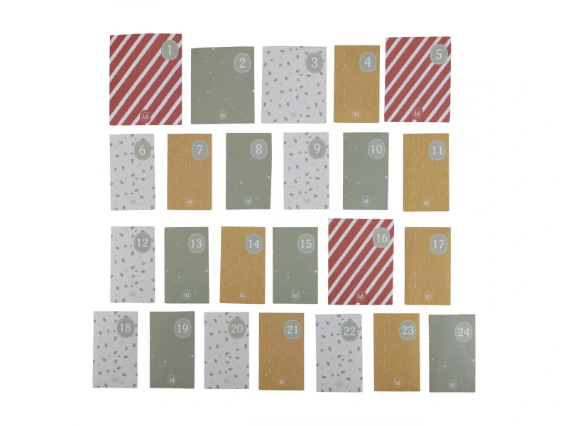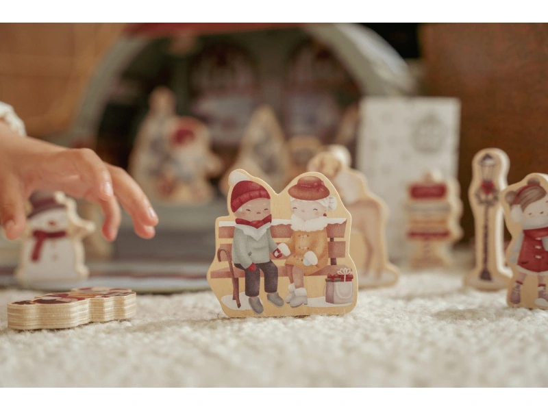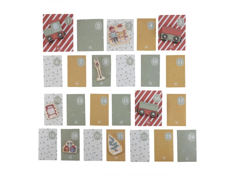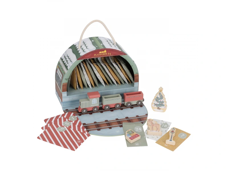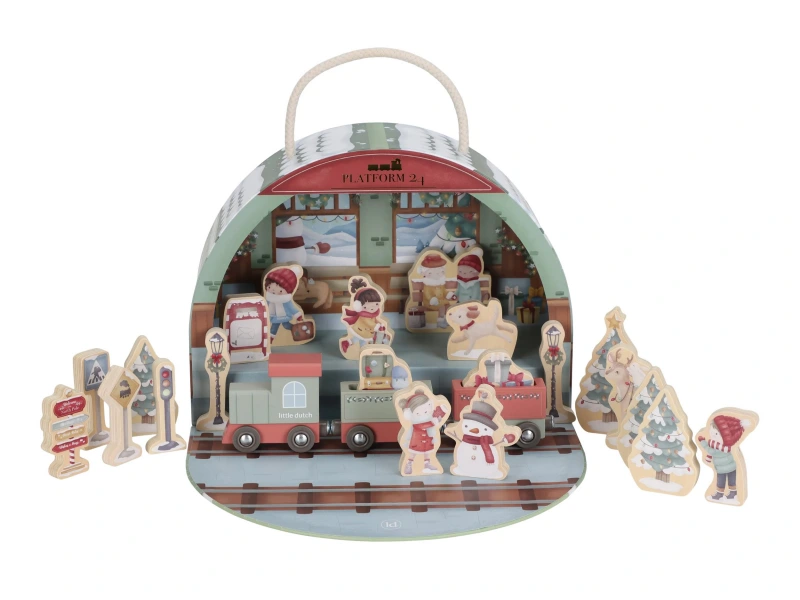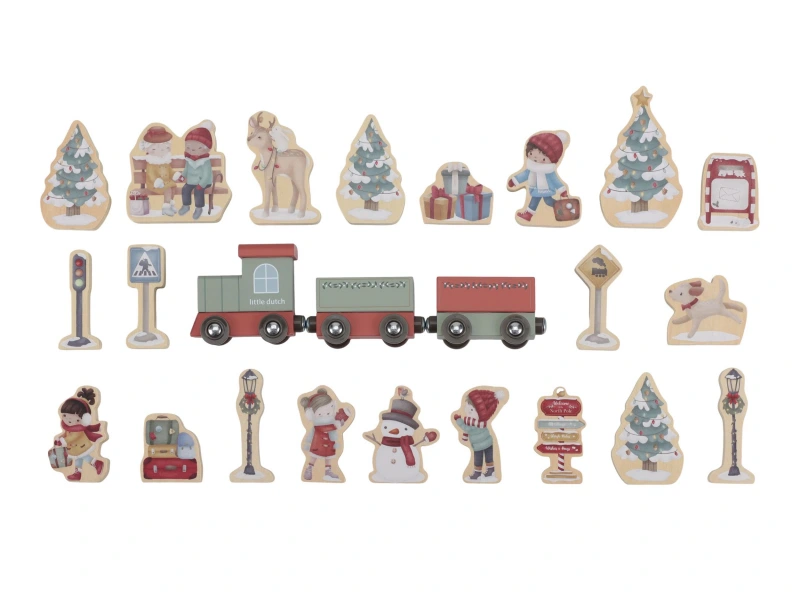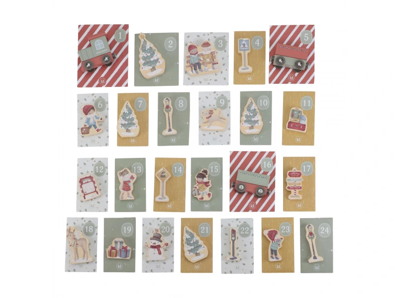 • 24 drevených prekvapení – lokomotíva, snehuliak, sob, stromčeky, kufre a ďalšie doplnky