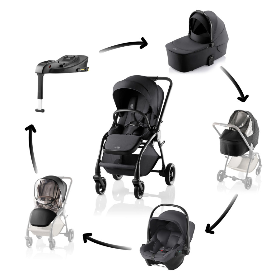 Športový kočík Britax Römer Rio, hlbokú vaničku Britax Römer Rio, autosedačku Baby-Safe Core, základňu Baby-Safe Core Base, pláštenku na kočík Rio a pláštenku na hlbokú vaničku Rio.