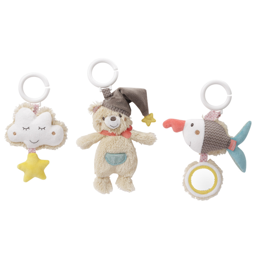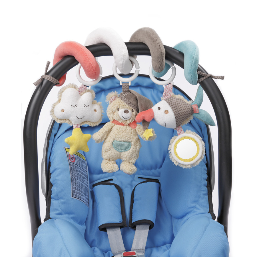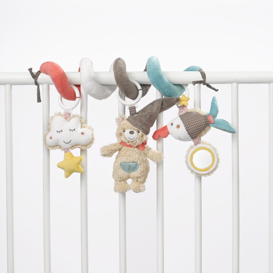 Farebná, plyšová špirála je príjemná na dotyk a vďaka zaveseným hračkám nabáda deti k objavovaniu nových podnetov. Stimuluje ich zmysly a poskytuje im zábavu. Na špirále sú tri veselé prívesky v tvare mraku, medvedíka a rybičky. Hračky na špirále sú pohyblivé vďaka krúžkom a možno ich individuálne meniť.