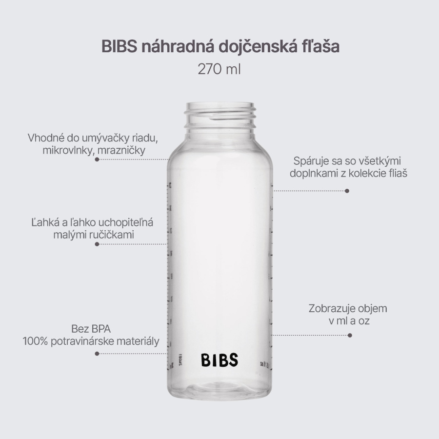 Náhradná plastová fľaša BIBS s objemom 270 ml je určená pre rodičov, ktorí potrebujú praktické riešenie pre väčšie porcie mlieka alebo tekutín. Slúži ako samostatné telo fľaše, ku ktorému si môžete zvoliť vhodný cumlík a uzáver podľa veku dieťatka a spôsobu kŕmenia. Vďaka bezpečnému materiálu a systému MIX&MATCH sa jednoducho prispôsobí každodenným potrebám rastúceho bábätka.