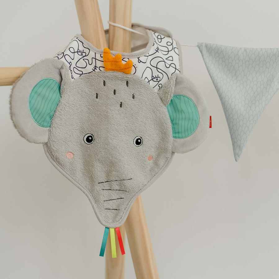 Podbradník na slintanie, handričku na vypľutie a ochrana proti poliatiu v jednom: Sivý podbradník z froté v tvare slona ponúka optimálnu ochranu pri jedle. Zapínanie na suchý zips uľahčuje pripevnenie. Materiál odoláva častému praniu a každodennému používaniu. Dokonalý darček pre bábätko.