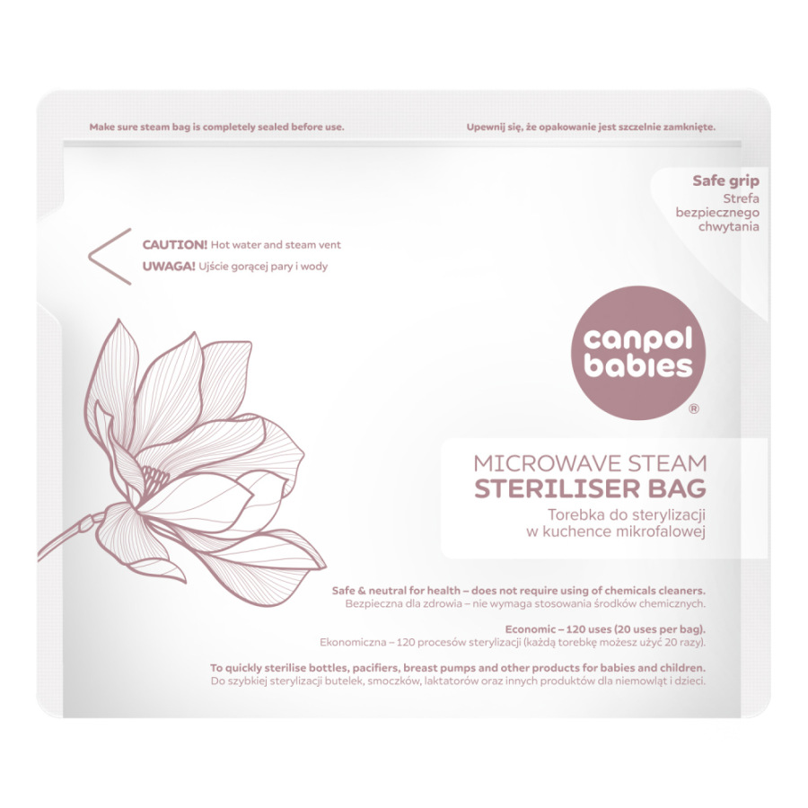 Sterilizačné vrecká do mikrovlnnej rúry Canpol babies predstavujú jednoduchý, rýchly a bezpečný spôsob sterilizácie fliaš, cumlíkov, častí odsávačiek mlieka a ďalších dojčenských a detských produktov. Táto forma sterilizácie je bezpečná, bez chemikálií a trvá iba 90 sekúnd. Vodná para, ktorá sa vo vrecku vytvára počas procesu sterilizácie, eliminuje baktérie a choroboplodné zárodky a zaisťuje hygienickú čistotu. Každé vrecko je možné použiť až 20-krát, čo umožňuje celkom 120 sterilizácií v jednom balení. Tento produkt nahrádza tradičný sterilizátor, keď ste mimo domova a nemôžete si prístroj vziať so sebou alebo máte doma nedostatok úložného priestoru. Sú vyrobené z nezávadného plastu, bez BPA a iných škodlivých látok.