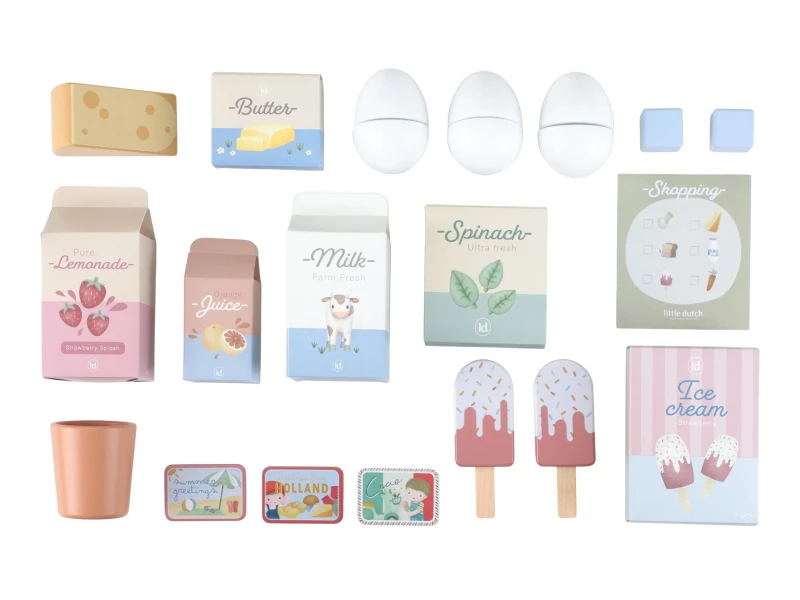 - súčasťou balenia je 19 doplnkov – potraviny, nápoje, vajíčka, ľad, zmrzliny, magnety aj nákupný zoznam,