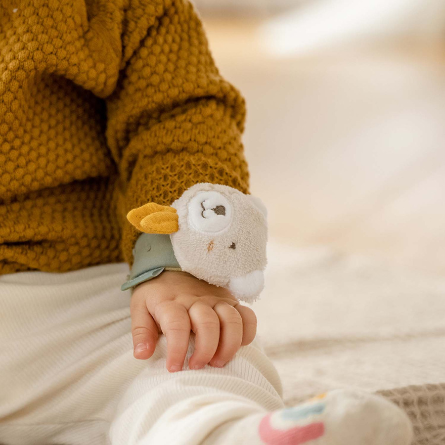 Ľahko sa nasadzuje na ručičku, pri pohybe dieťatka – trasenie ručičkami vydáva fascinujúce zvuky, ktoré malé deti milujú. Hrkajúci náramok hravou formou podporuje sluch, úchop a hmat bábätka aj jemnú motoriku.