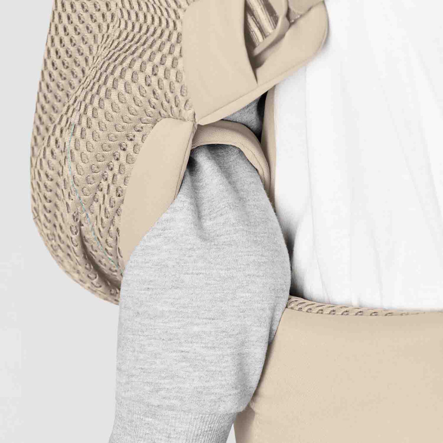 Nosítko je navrhnuté tak, aby podporovalo správnu polohu bedier v tvare písmena M a prirodzené zakrivenie chrbtice v tvare písmena C. Táto ergonomická poloha je kľúčová pre zdravý vývoj bedrových kĺbov už od prvých dní života. Mäkké polstrovanie v oblasti kolien v kombinácii s pružnou tkaninou chrbtového panelu pomáha vytvoriť prirodzené podsadenie panvy a stabilnú oporu chrbta. Dieťa tak zostáva v pohodlnej, bezpečnej pozícii a zároveň má dostatok voľnosti na vnímanie okolia a spoločné objavovanie sveta.