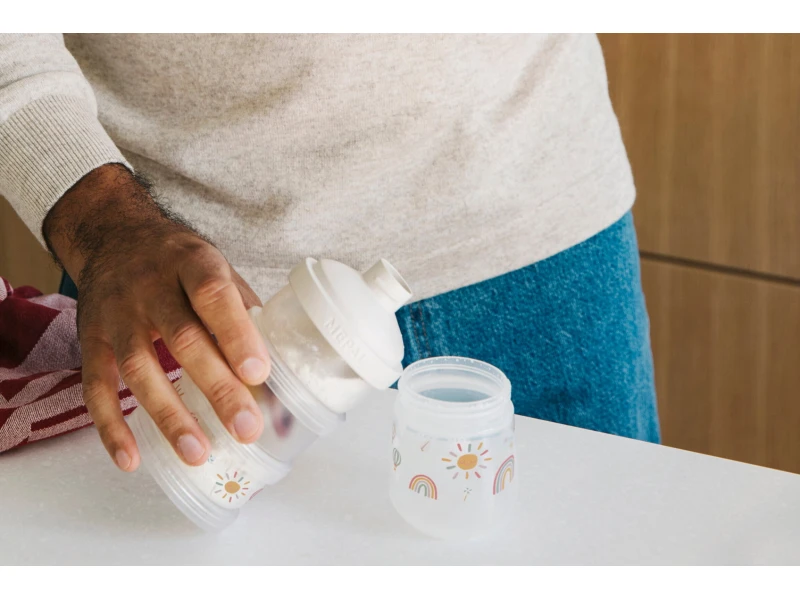 Praktický dávkovač sušeného mlieka pre jednoduchú prípravu na cestách
