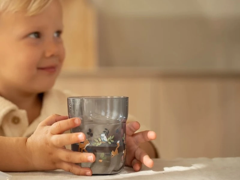 - Téglik z priehľadného odolného plastu pre deti učiace sa piť z pohára