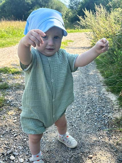 Šatka je vyrobená z priedušného materiálu. Bavlna zabezpečuje hypoalergénny charakter šatky. Naopak elastan zabezpečuje jeho prispôsobivosť a priľnavosť k malej a citlivej detskej hlavičke. Perfektná na leto k vode alebo do záhrady na ochranu detskej pokožky pred slnkom.