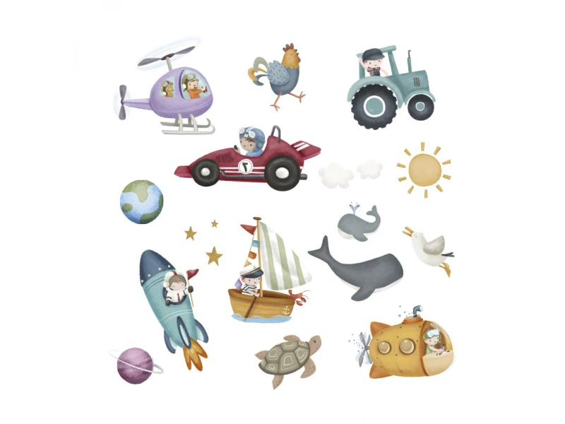 – Zábavné motívy dopravných prostriedkov, zvierat a postavičky Jima