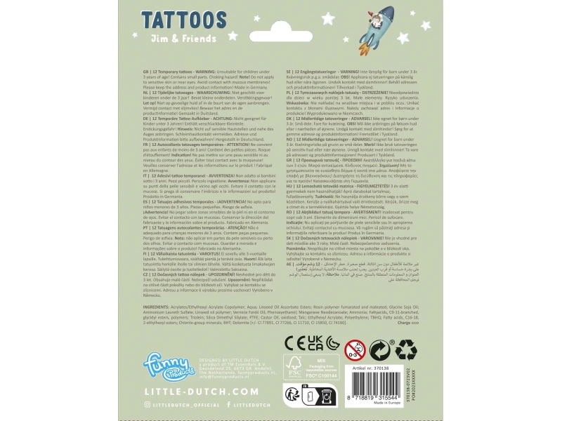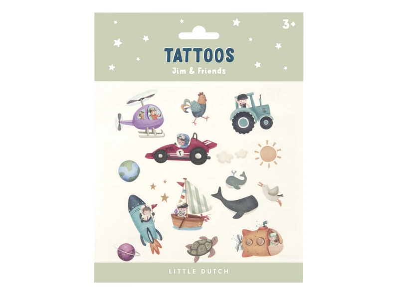 Vaše dieťa sa môže zabaviť s veselými tetovaniami s motívmi Jima, dopravných prostriedkov a zvierat, ktoré sa ľahko aplikujú pomocou vlhkej hubky. Tento set je ideálny pre deti od 3 rokov, ktoré rady objavujú nové spôsoby hry a kreativity. Zabráňte nudeniu a doprajte deťom farebnú a bezpečnú zábavu počas hry či osláv.