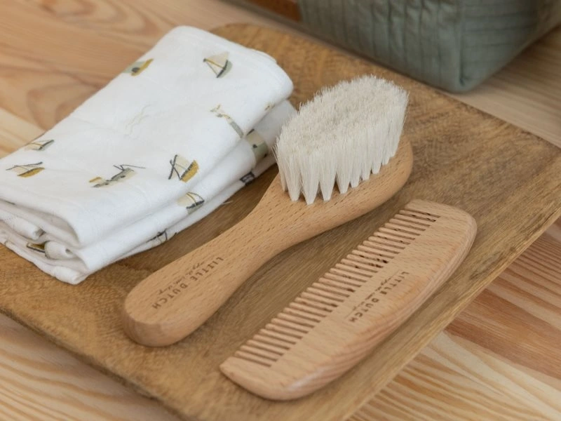 Jemná starostlivosť o prvé vlásky bábätka s prírodnou drevenou kefou a hrebeňom