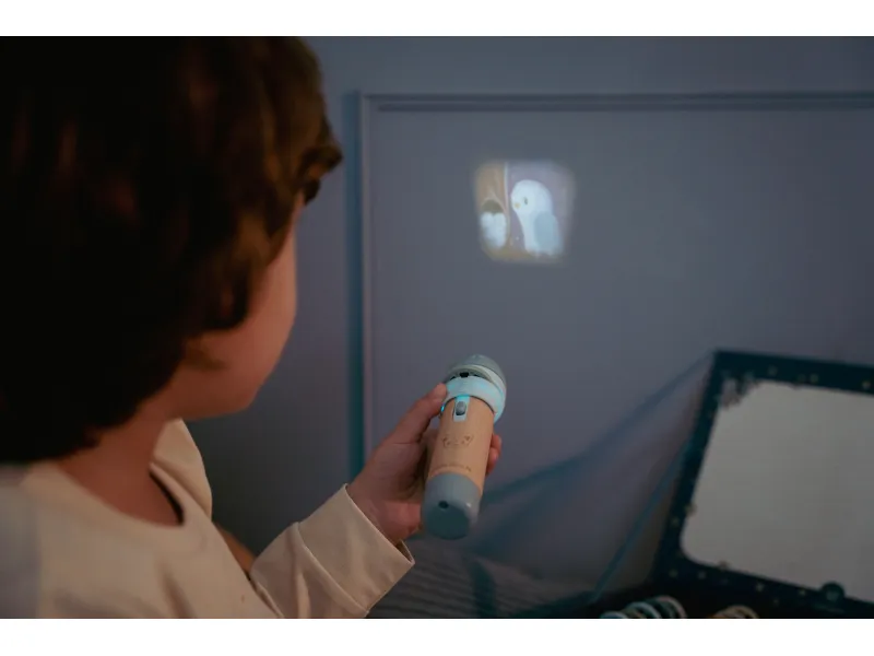 Tento ručný projektor prinesie do detskej izby kúzelnú atmosféru večerného rozprávania. Pomocou 12 premietacích kotúčikov môžu deti objavovať rôzne príbehy plné krásnych ilustrácií, ktoré sa premietajú priamo na stenu. Projektor s drevenou rukoväťou funguje ako baterka a je ideálny pre spoločné čítanie, relax pred spaním či tiché chvíle s rodičmi. Stačí zhasnúť svetlá a nechať sa uniesť do sveta rozprávok.
