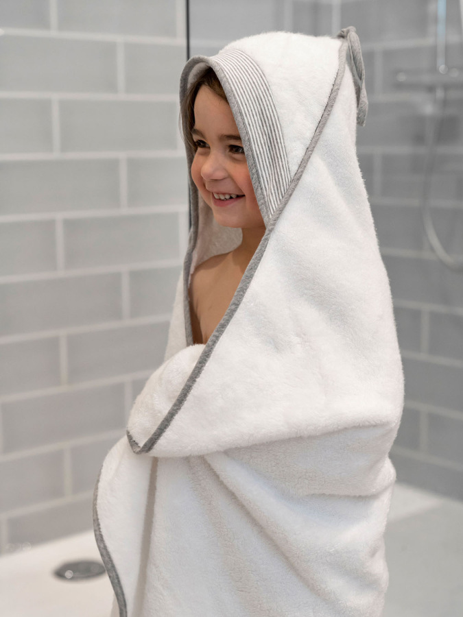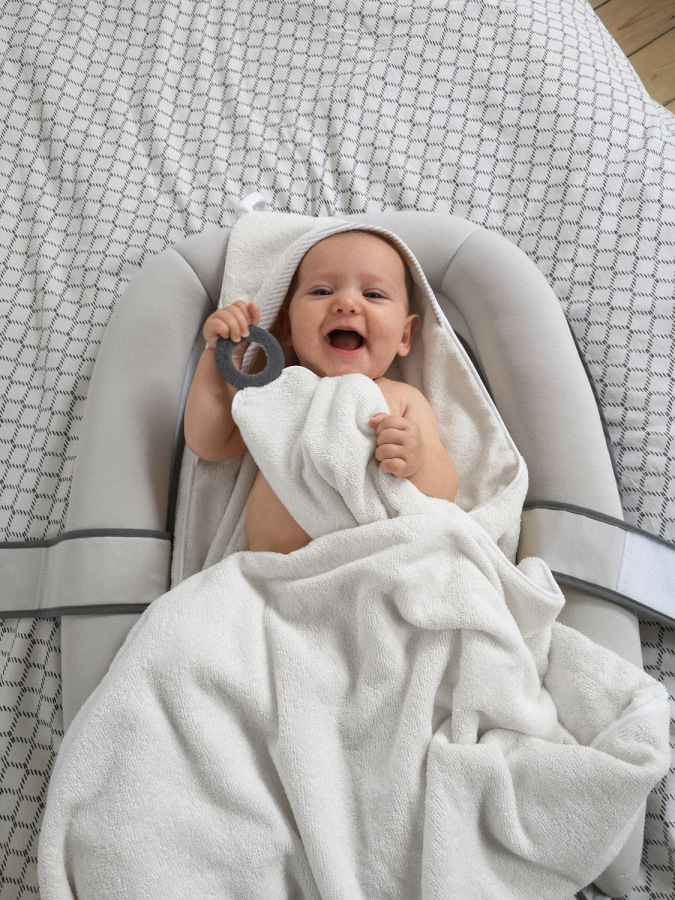Uterák Doomoo Dry&Play je dostatočne veľký, aby sa do neho po kúpeli zababušili aj väčšie deti. Je vyrobený z mäkkej organickej bavlny a má certifikát OEKO-Tex.