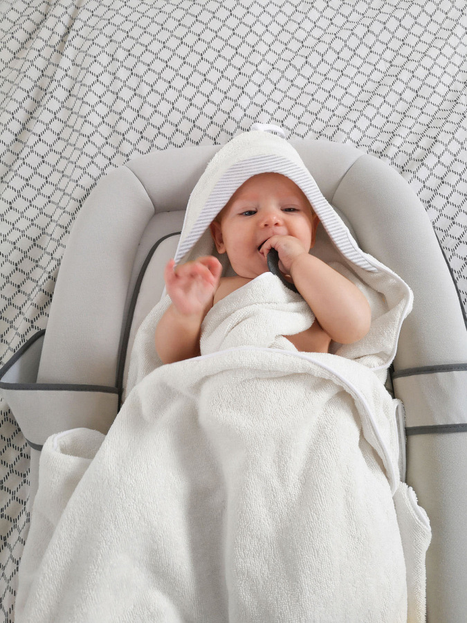 Hebučký uterák s kapucňou Doomoo Dry&Play nie je len tak obyčajný uterák. Vďaka vychytávke v podobe silikónového kolieska, si ho rodičia ľahko pripevnia okolo krku na svoje telo, získajú tak voľné ruky na pohodlné a bezpečné umývanie dieťatka, a navyše sú chránení pred cákanci. Po kúpeli, dieťatko vo svojom náručí pohodlne zabalí do uteráka a silikónové koliesko poslúži ako hryzátko.