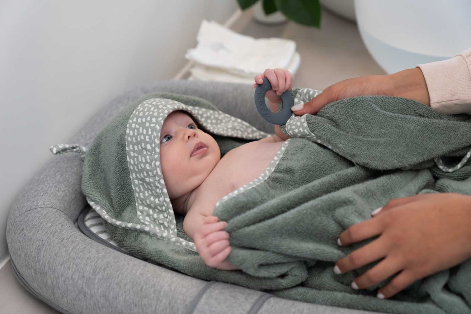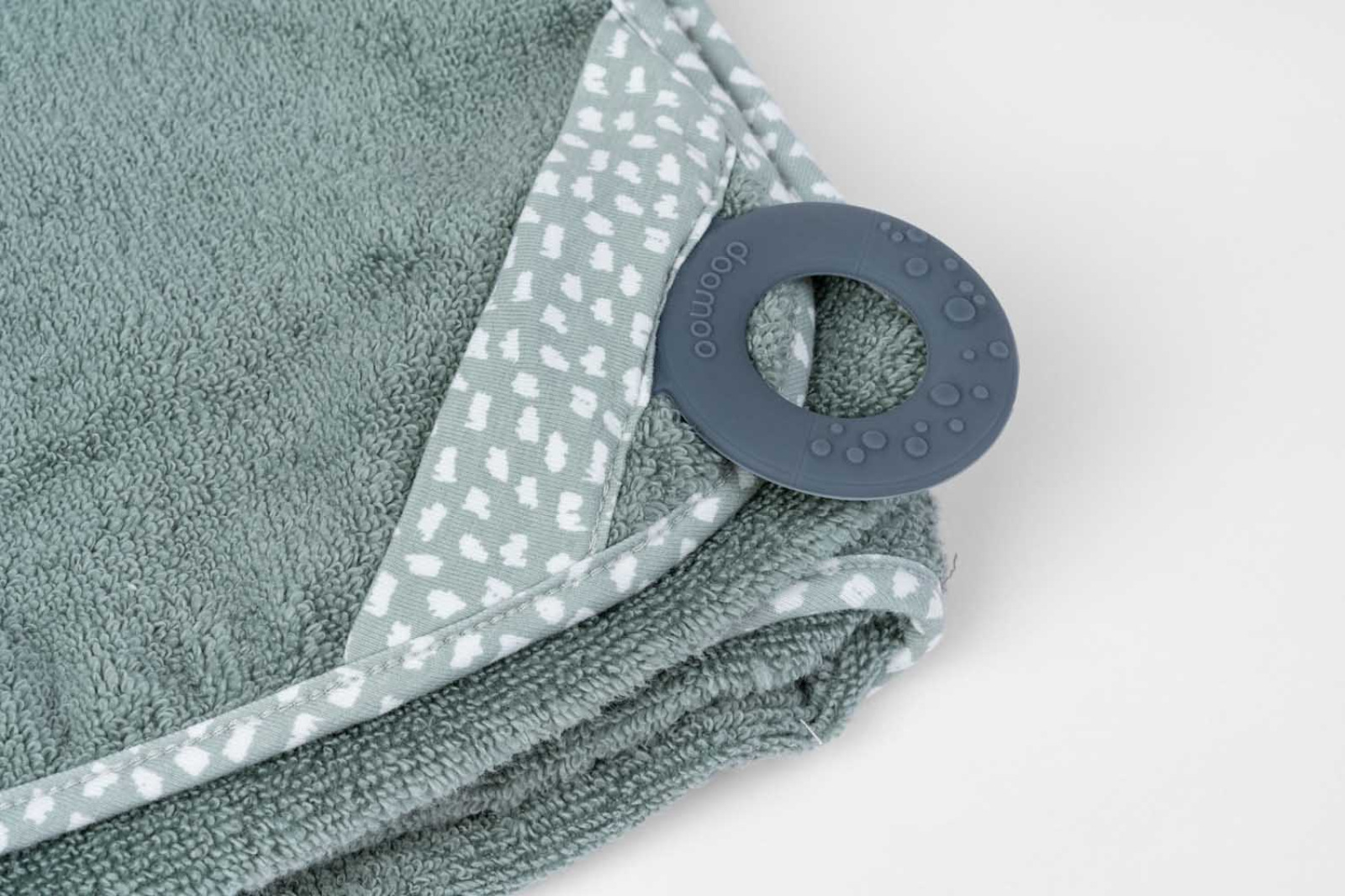 Hebučký uterák s kapucňou Doomoo Dry&Play nie je len tak obyčajný uterák. Vďaka vychytávke v podobe silikónového kolieska, si ho rodičia ľahko pripevnia okolo krku na svoje telo, získajú tak voľné ruky na pohodlné a bezpečné umývanie dieťatka, a navyše sú chránení pred cákanci. Po kúpeli, dieťatko vo svojom náručí pohodlne zabalí do uteráka a silikónové koliesko poslúži ako hryzátko.