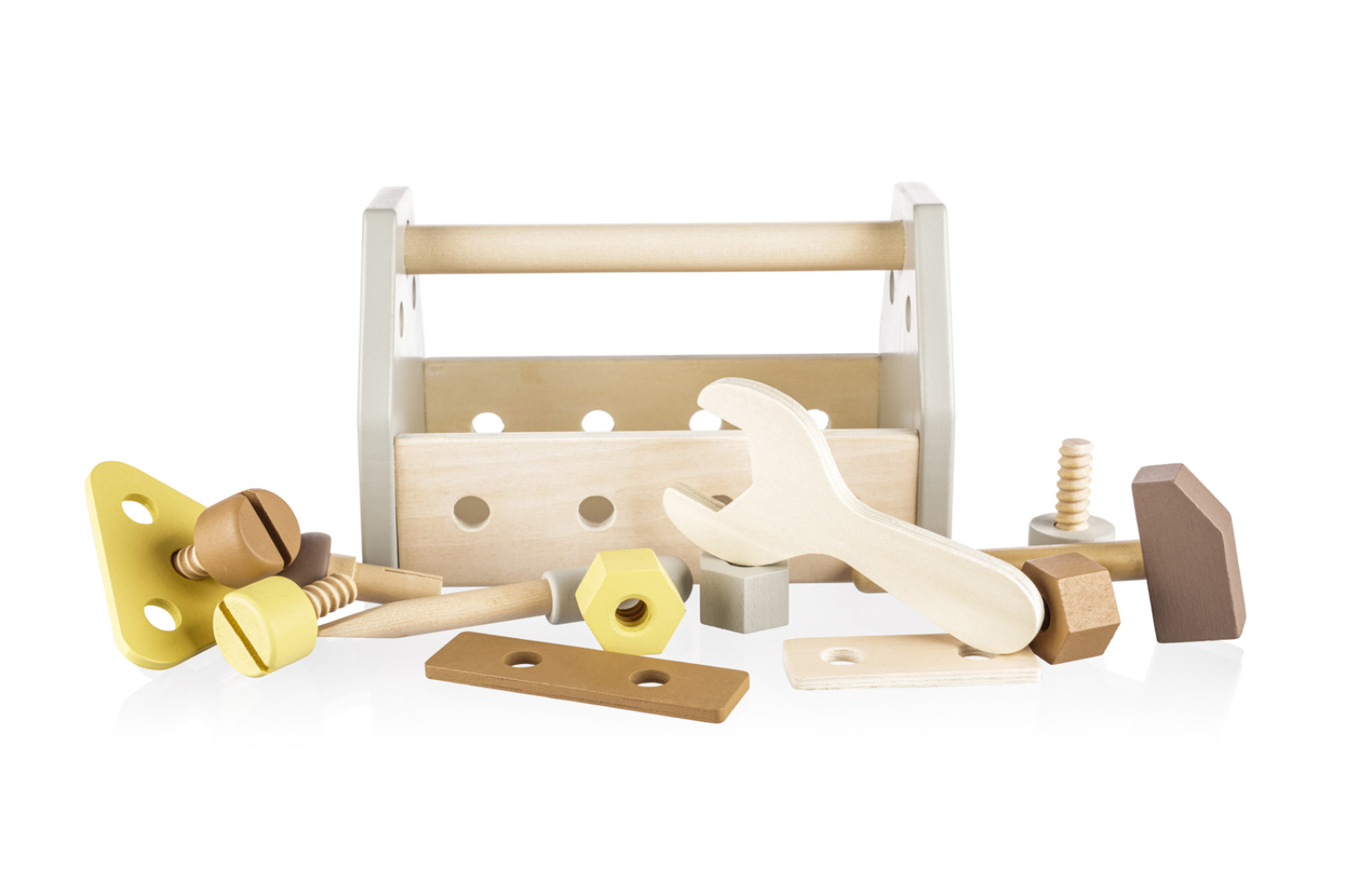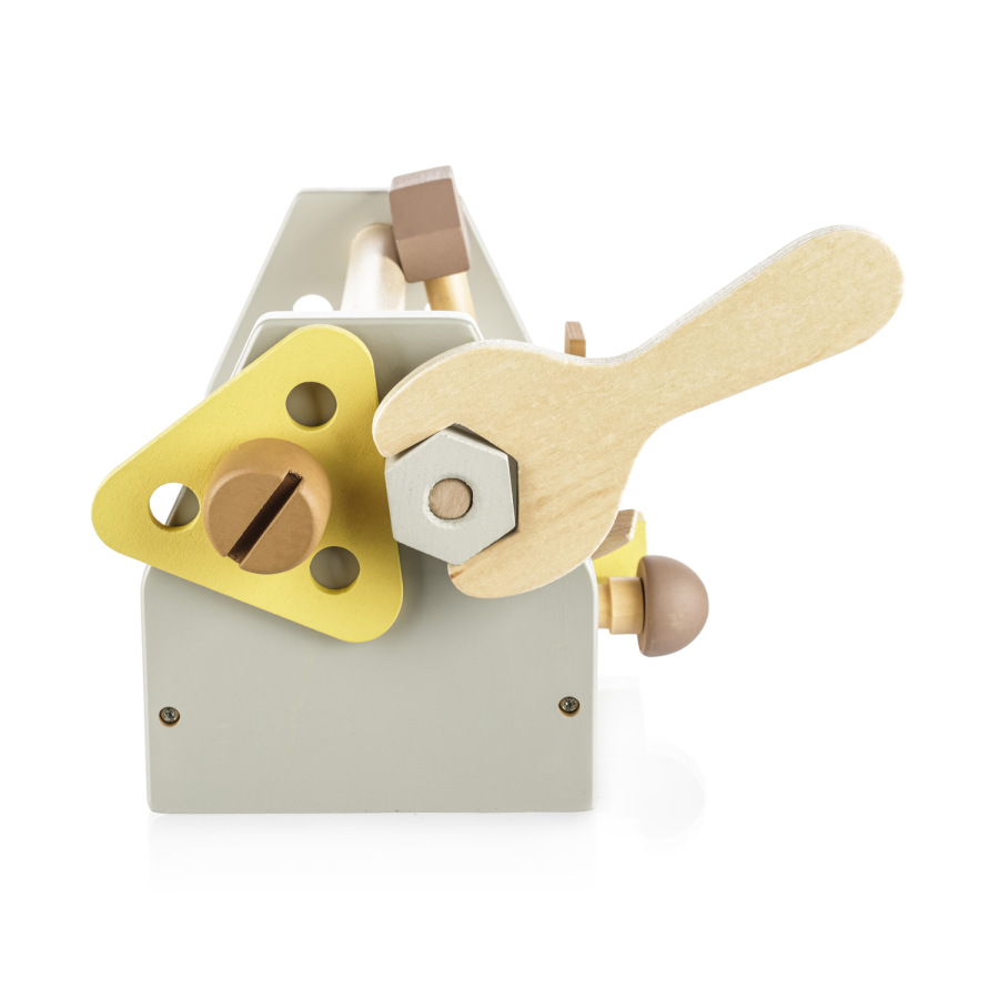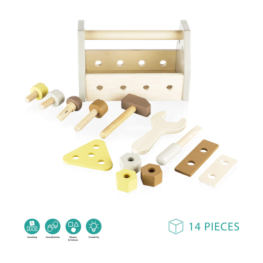 Prvá sada náradia pre malých šikovných staviteľov obsahuje kladivo, skrutkovač, kľúč, 3 matice, 3 skrutky, 1 klinec, 3 drevené komponenty a veľkú škatuľu, do ktorej možno umiestniť všetky časti hračky.