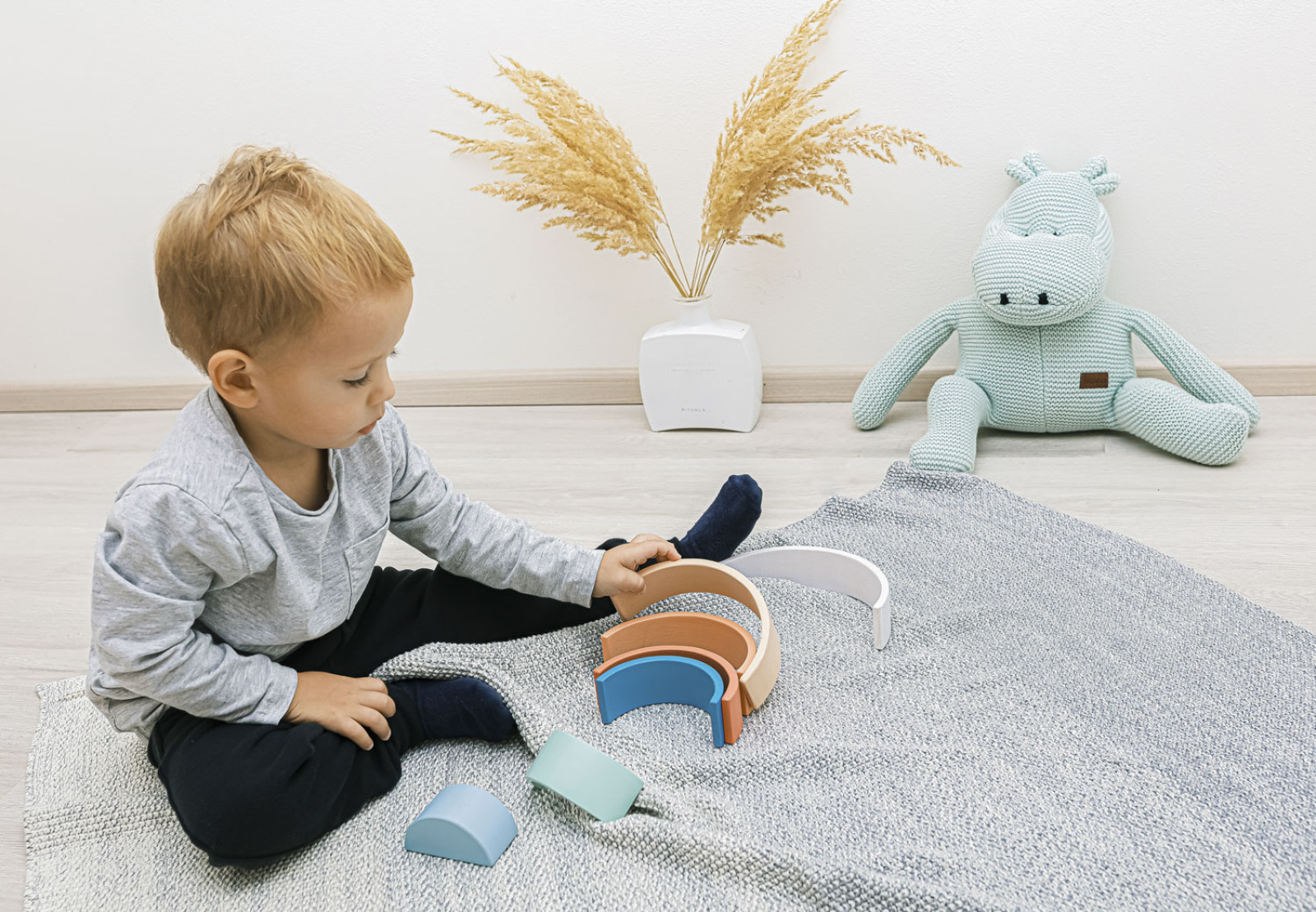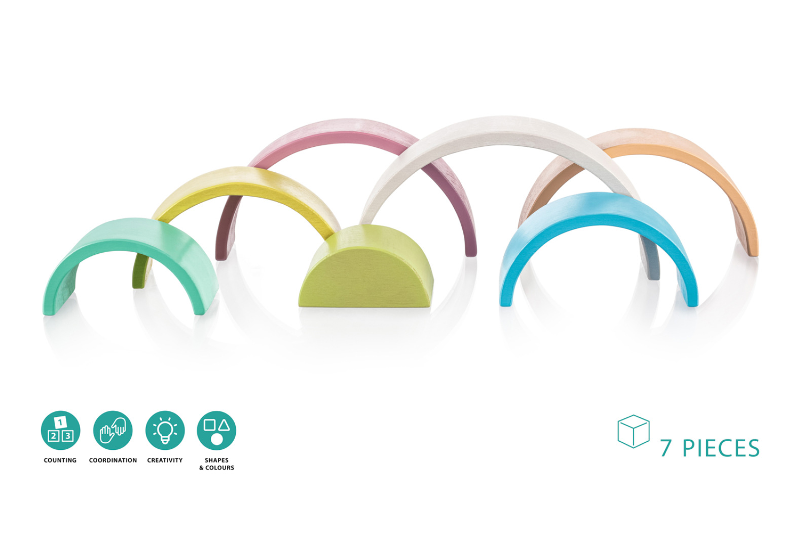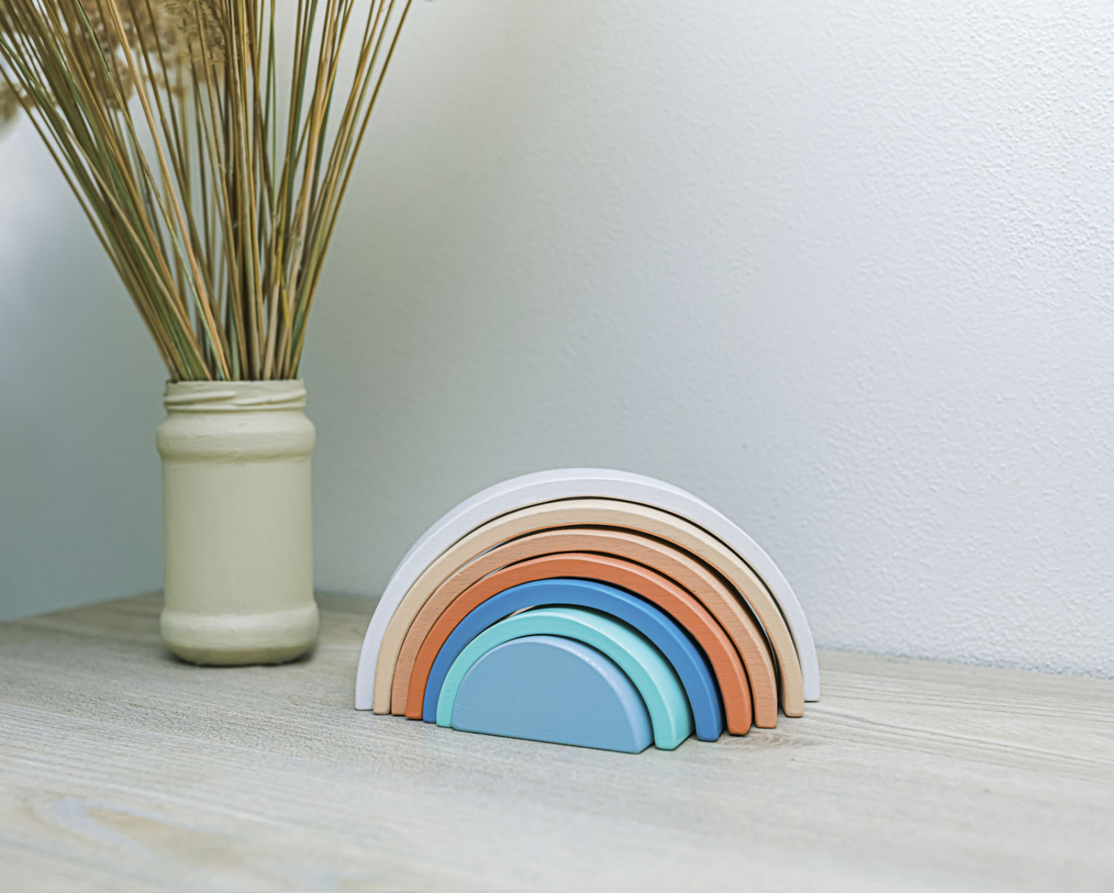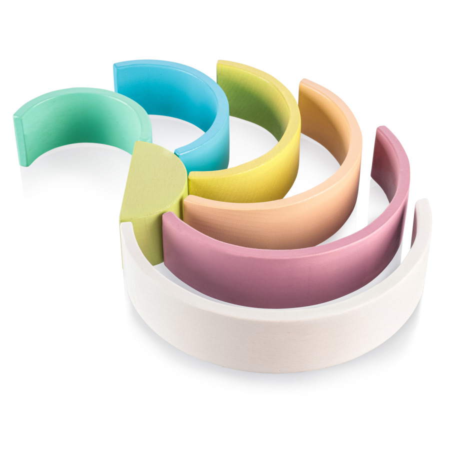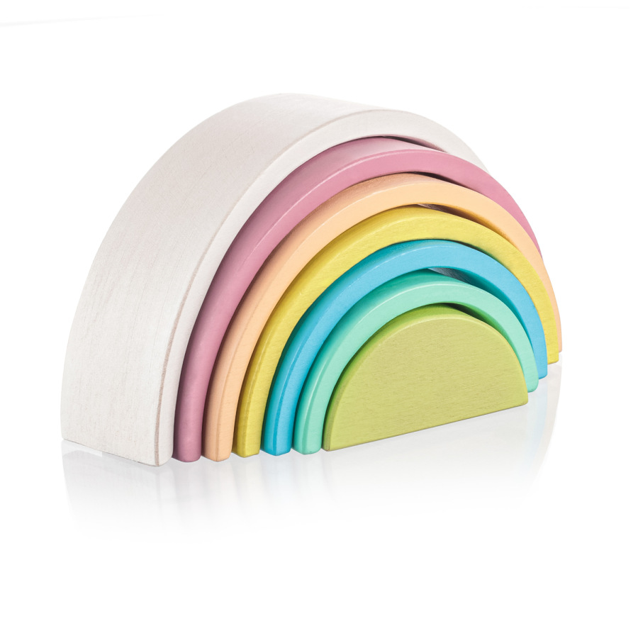 Drevená dúha v pastelových farbách. Vhodné pre deti od 18 mesiacov.