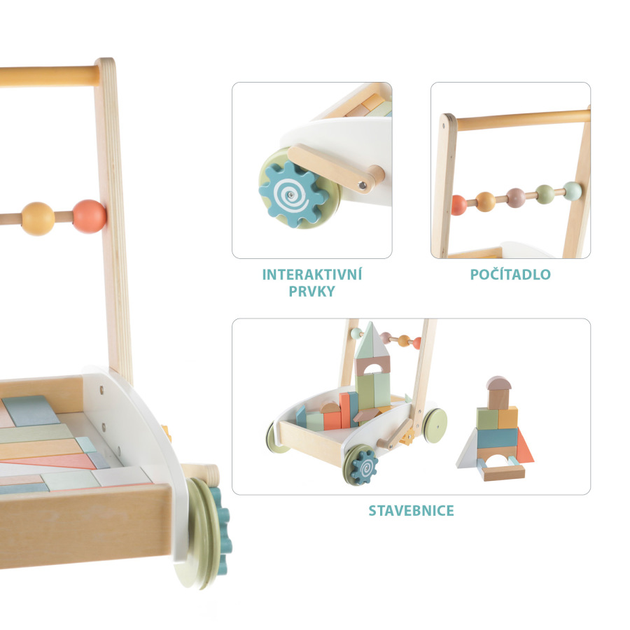 Kompaktný vozík s drevenou rukoväťou je plný rôznofarebných kociek, z ktorých si