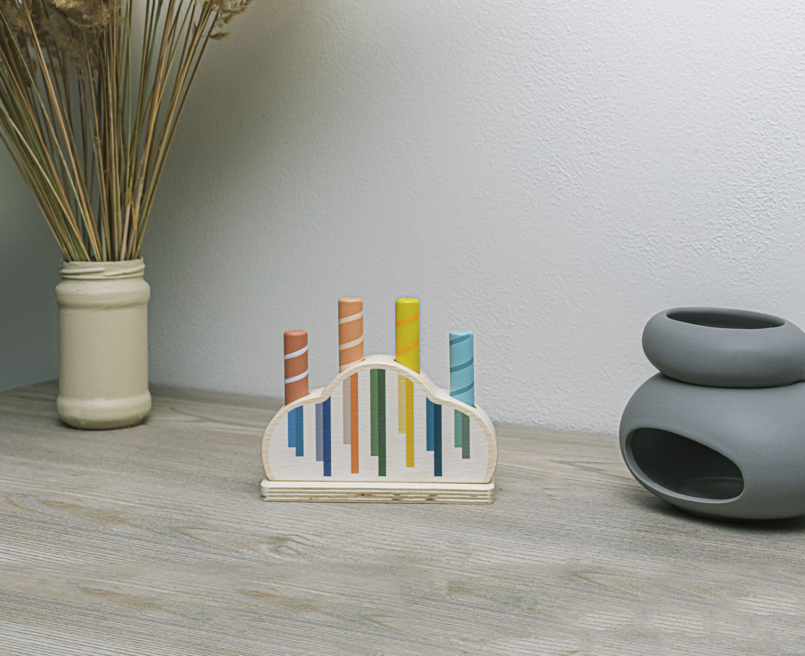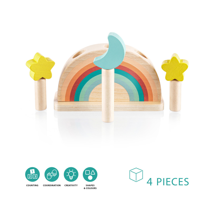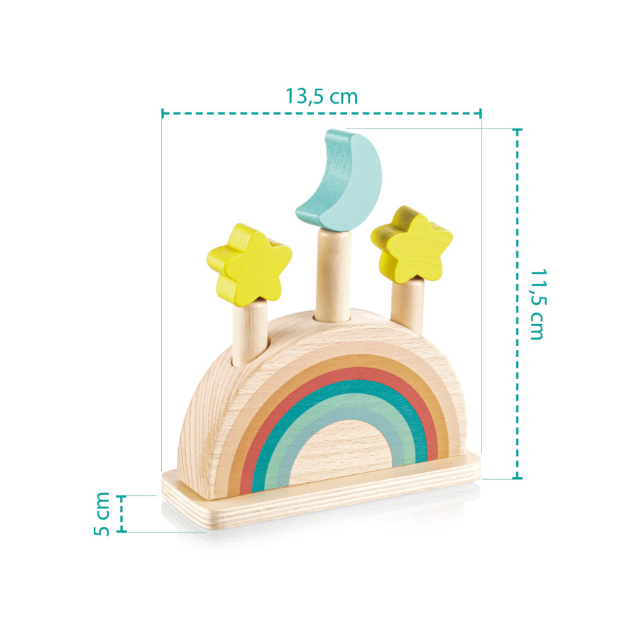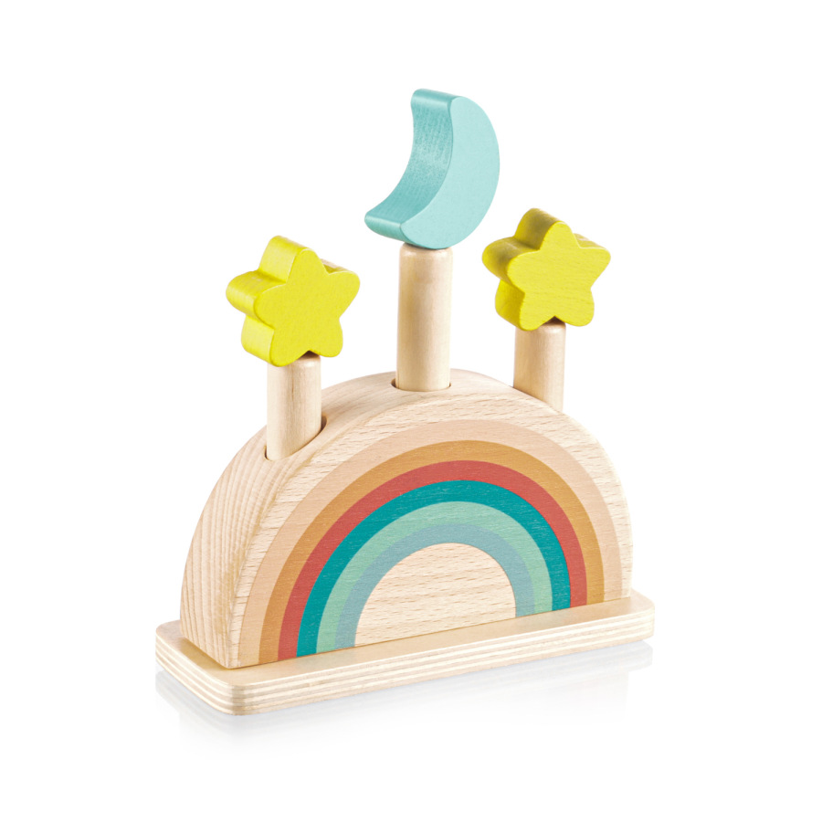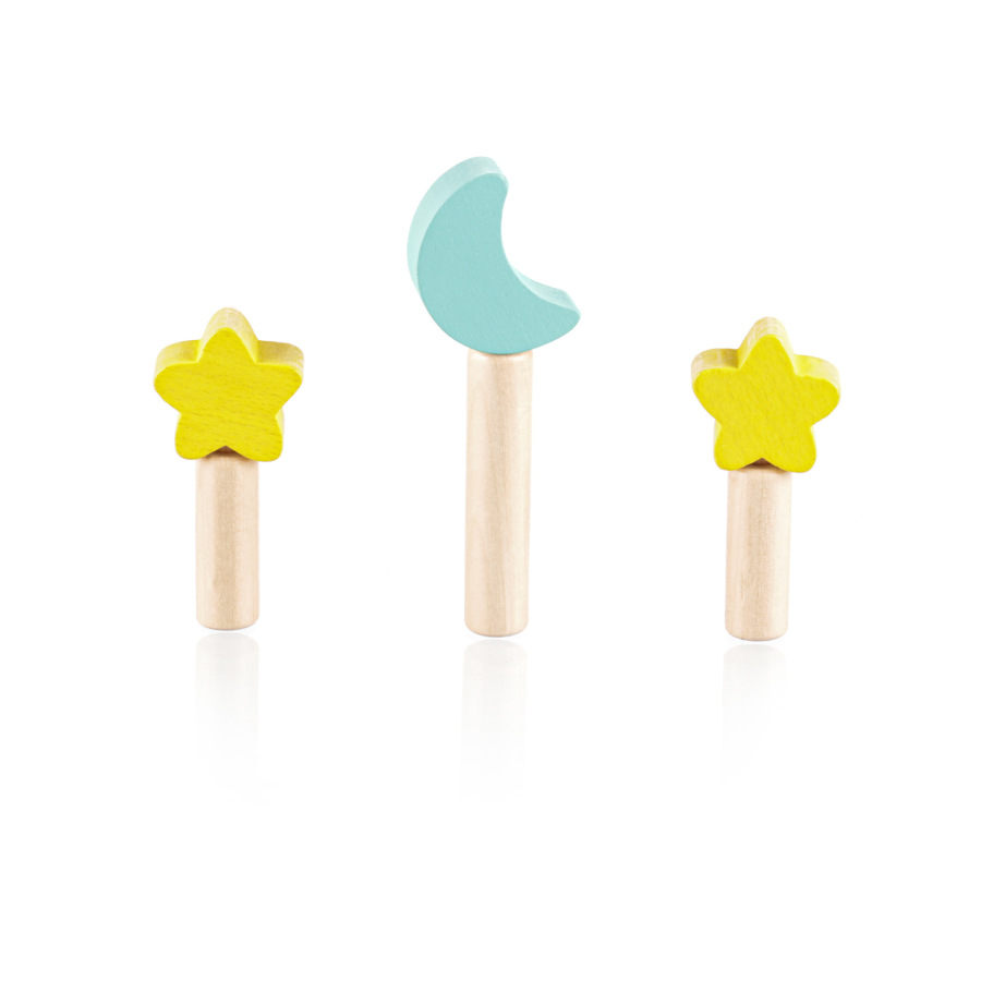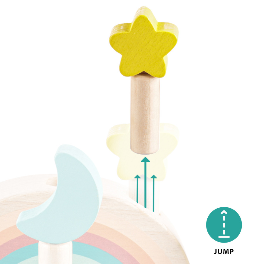 Zabavte svoje dieťa na dlhé hodiny s vyskakovacou drevenou hračkou. Tri farebné kolíky s motívom mesiaca a hviezdy sú upevnené v drevenom podstavci s pružinami. Keď tieto kolíky jemne stlačíte, uvoľnia sa a pružina ich nechá vyskočiť. Hračka rozvíja motorické zručnosti, koordináciu a sústredenie, takže je ideálna na skoré učenie. Vyrobené z prírodného bukového dreva.