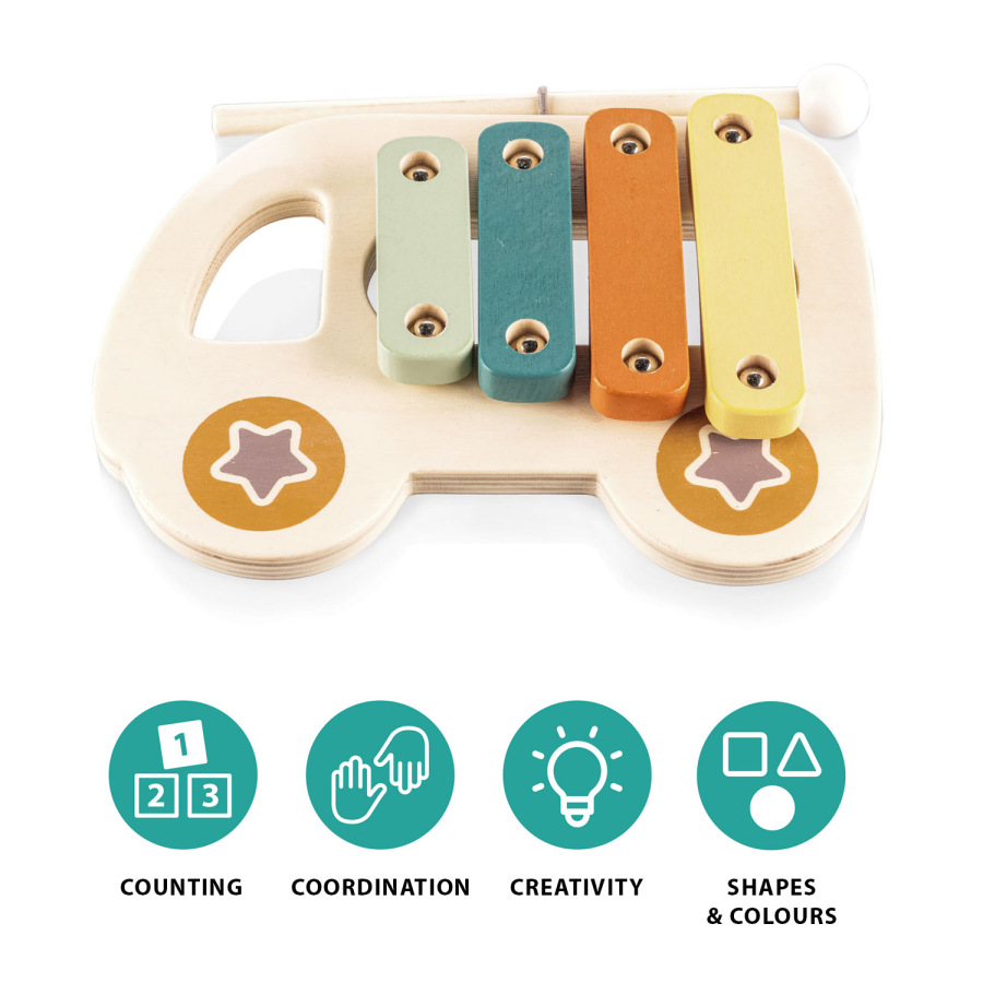 Roztomilý xylofón v tvare auta zaujme zvedavé deti na prvý pohľad. Jednoduchý kompaktný tvar dopĺňa praktická rukoväť, vďaka ktorej sa hračka ľahko drží a prenáša. Na boku xylofónu je šikovne umiestnená pružná gumička, ktorá drží paličku a zabraňuje jej strate. Hračka má kompaktné rozmery, ktoré sú ideálne pre malé detské ruky. Nízka hmotnosť potom zaručuje ľahké držanie.