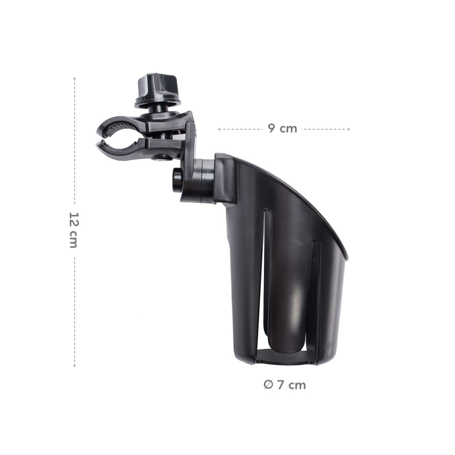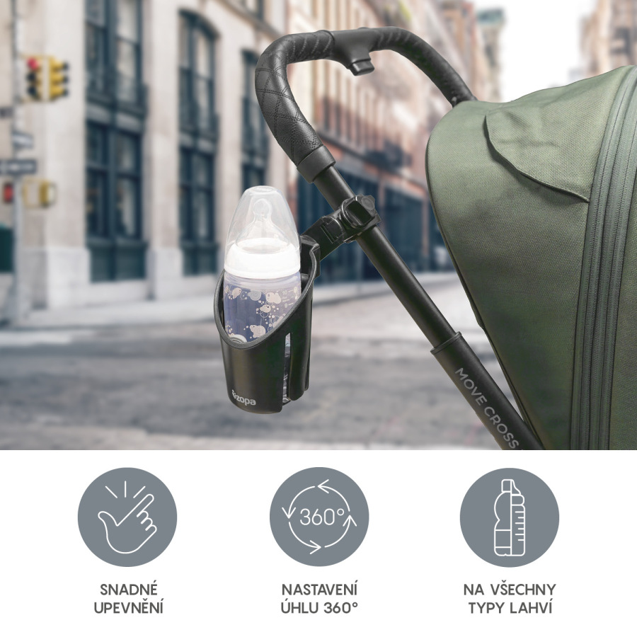 Držiak na fľašu s pitím vhodný na väčšinu typov kočíkov, ale aj na detské bicykle, kočíky pre bábiky a pod. Klapky drží fľašu pevne na svojom mieste a vďaka tlačidlám možno držiak nastaviť do potrebného uhla. Jednoducho sa pripevňuje aj odníme.