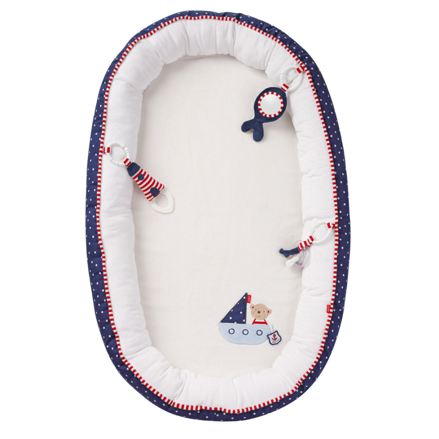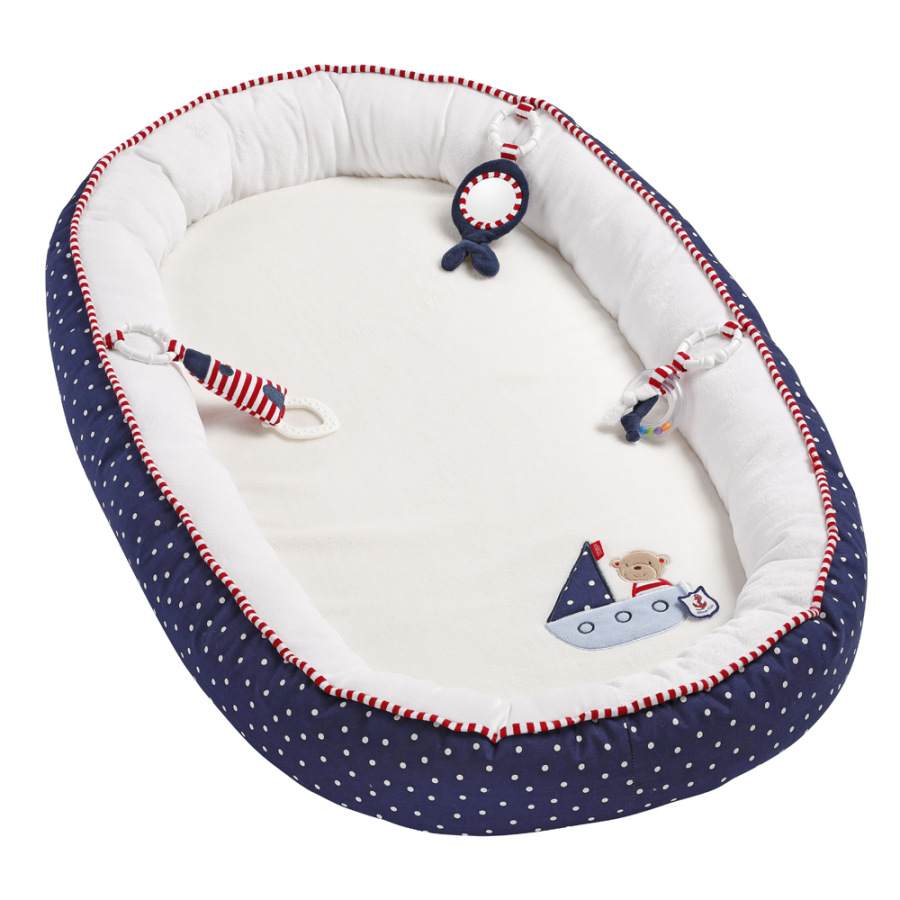 Plyšové hniezdočko z kolekcie Ocean Club s povrchom na ležanie vyrobeným z extra mäkkých materiálov priamo nabáda k maznaniu, spánku a hre. Vďaka obzvlášť mäkkému a polstrovanému okraju je v ňom dieťatko rozmaznávané pohodlím navodzujúcim pocit ochrany a bezpečia. Pritom na dosah ruky má tri odnímateľné hračky podporujúce zvedavosť dieťaťa a starajúce sa o jeho zábavu pri hraní. Ich súčasťou je hrkálka, zvrásnený papier a zrkadlo, ktoré prispievajú k tréningu motoriky. Mäkké hryzátko potom pomáha vo fáze hryzenia.