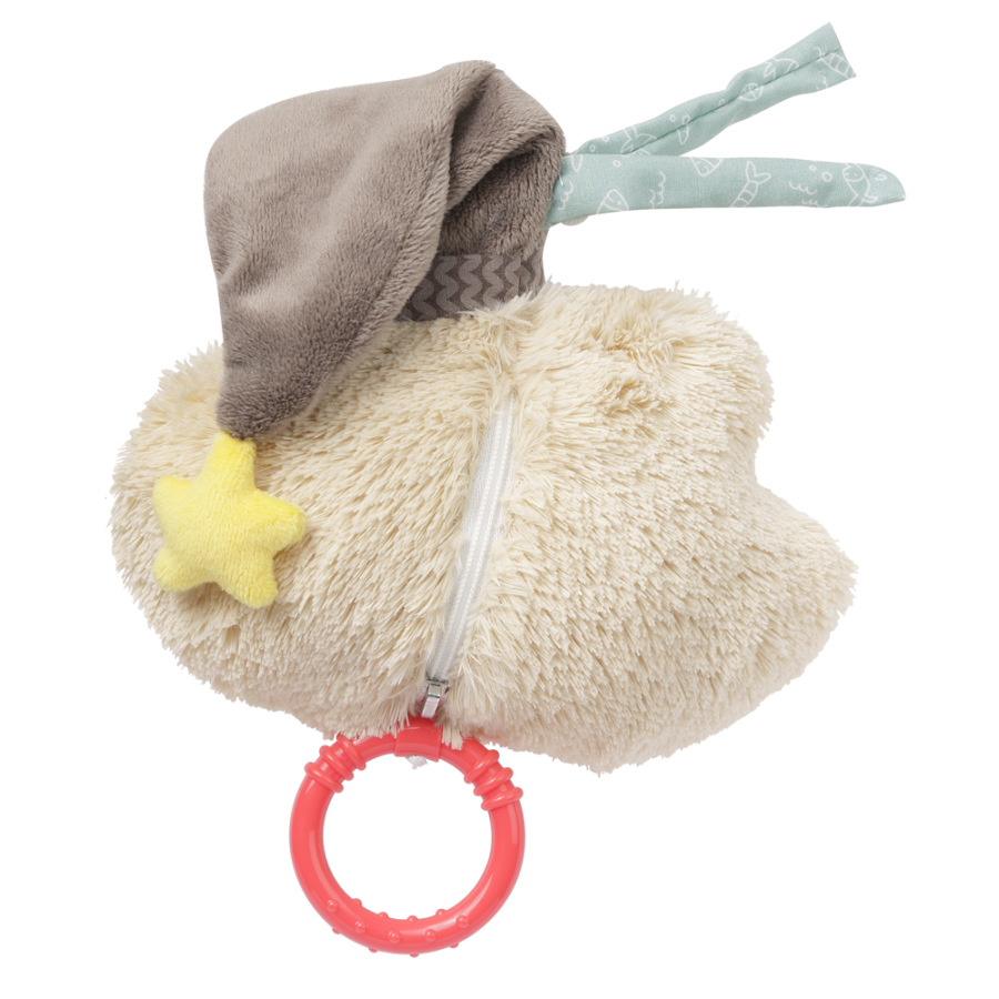 Plyšový obláčik s hracím strojčekom, ktorý sa spúšťa zatiahnutím za krúžok. Strojček možno vybrať, hračka má zips. Príjemné tlmené farby, a mäkký materiál, to všetko nabáda k maznanie a dieťa upokojuje. Vďaka dvom pásikom hračku rýchlo pripevníte na kočík, detské sedačky a detskú postieľku