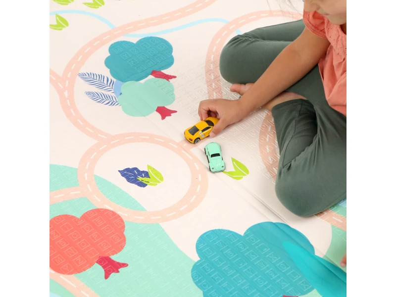 • Obojstranný dizajn – jemný interiérový vzor + hracia dráha pre autíčka