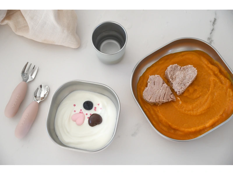 Bezpečná jedálenská sada pre bábätká, ktoré začínajú so samostatným jedením
