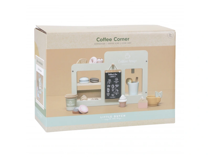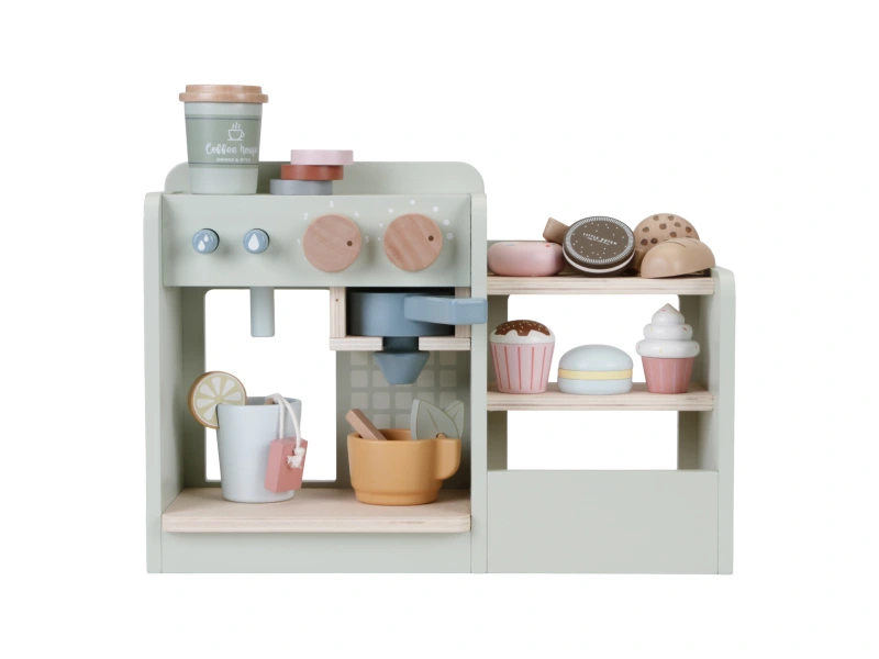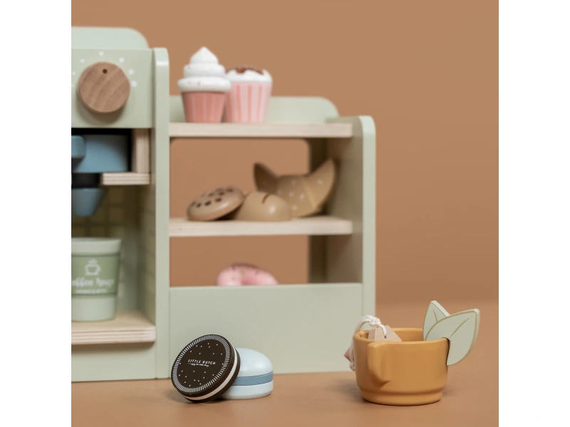 Drevený kávovar s bohatým príslušenstvom je ideálny pre malých baristov, ktorí radi napodobňujú dospelých. Podporuje kreatívnu hru, komunikáciu aj zapájanie fantázie pri príprave kávy či servírovaní zákuskov. Realistické ovládanie, kapsule a množstvo doplnkov umožnia deťom vytvoriť si vlastnú kaviareň priamo doma.