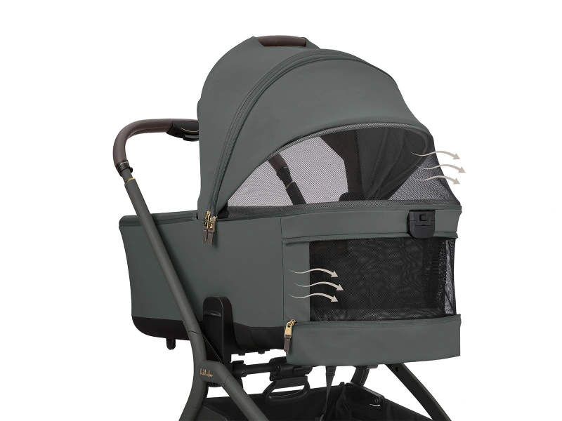 Pre pohodlie dieťaťa je súčasťou obojstranný mäkký matrac so zimnou stranou z kvalitného zamatového materiálu a letnou stranou z priedušnej sieťoviny pre lepšiu ventiláciu. Strieška má zipsové predĺženie, slnečnú clonu a dopĺňa ju extra slnečná clona pre maximálny tieň. Ventiláciu zaisťujú sieťované vetracie otvory na strieške aj v oblasti hlavy. Praktická je aj vrecko na telefón na zips.Vodeodolný textilný materiál s UPF 50+ chráni dieťa pred poveternostnými vplyvmi a slnečným žiarením.