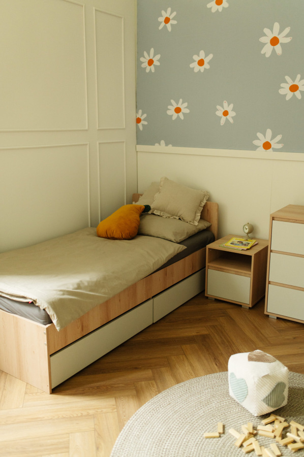 Detská posteľ DALIA s plochou na spanie 200 × 90 cm je ideálnou voľbou pre staršie deti a juniorov, ktorí potrebujú viac priestoru na pohodlný a nerušený spánok. Kombinácia bukového dekoru a moderného popolavého odtieňa pôsobí nadčasovo a ľahko zapadne do súčasných detských aj študentských izieb. Praktickým benefitom sú dve výsuvné zásuvky na posteľnú bielizeň, ktoré pomáhajú udržať poriadok v izbe.