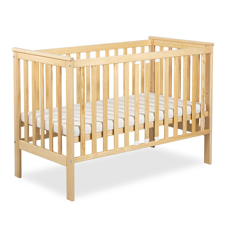 Detská postieľka IWON v rozmere 120 × 60 cm je útulným a funkčným riešením pre pokojný spánok bábätka už od narodenia. Prírodný odtieň borovicového dreva vnáša do detskej izby teplo a harmonickú atmosféru, ktorá pôsobí prirodzene a nadčasovo. Vďaka plochým priečkam má rodič dieťa stále pod kontrolou, pričom postieľka zostáva bezpečným miestom na oddych aj spánok.