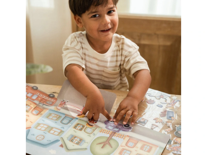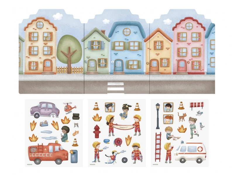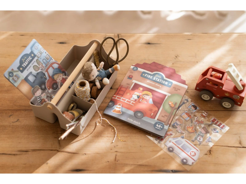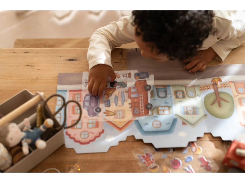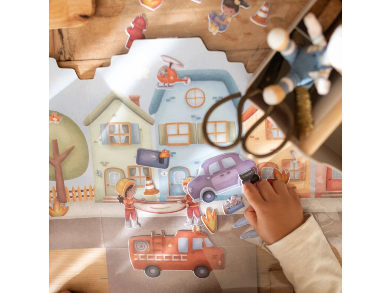 Sada opakovane použiteľných samolepiek Little Dutch s motívom hasičskej stanice a mestských ulíc podnecuje detskú fantáziu a pomáha rozvíjať jemnú motoriku. Deti môžu vytvoriť desiatky rôznych príbehov pomocou viac než štyridsiatich veselých 3D samolepiek, ktoré sa jednoducho pripevňujú aj odlepujú. Je to ideálny spoločník na hranie doma, v škôlke aj na cestách.
