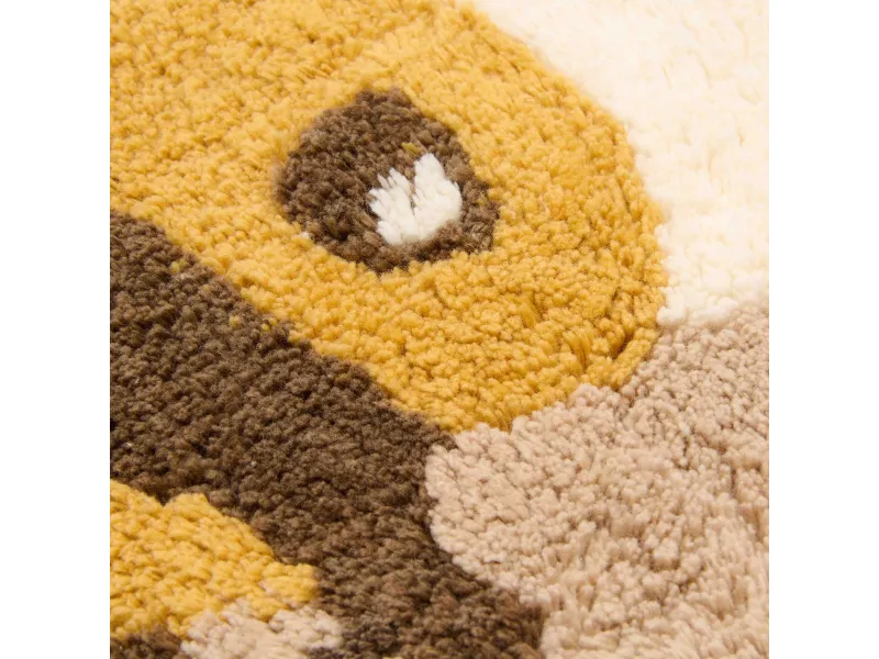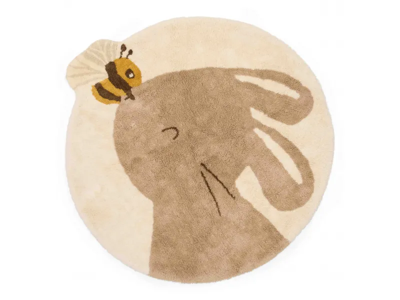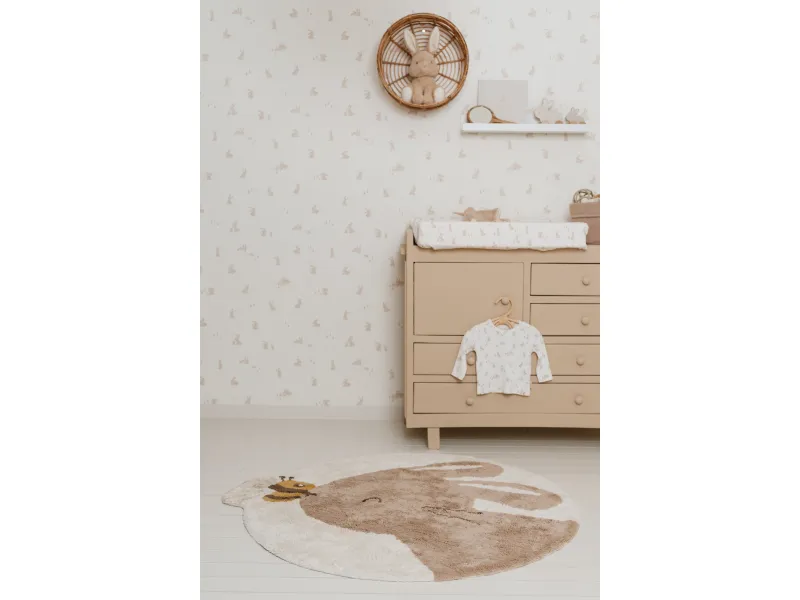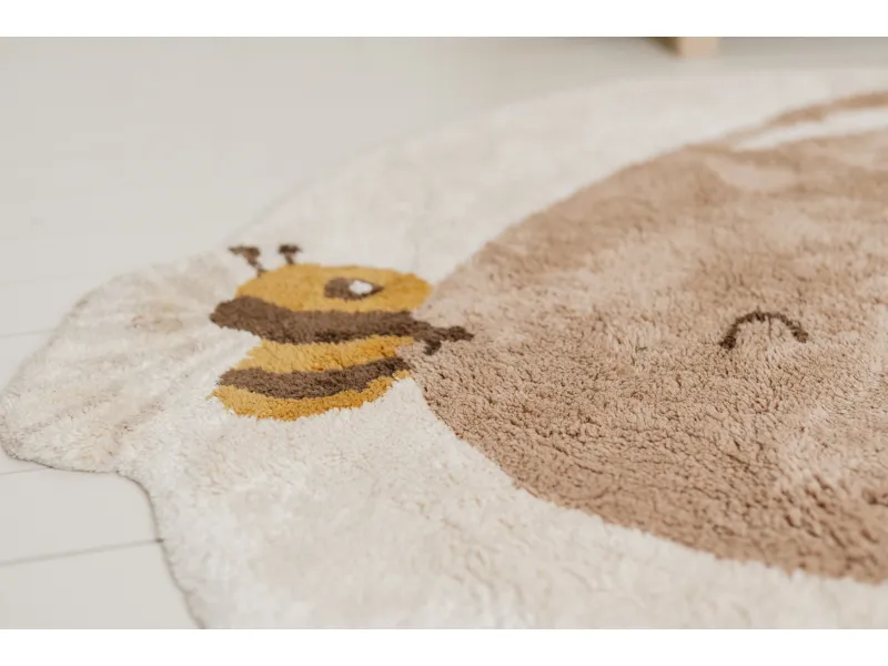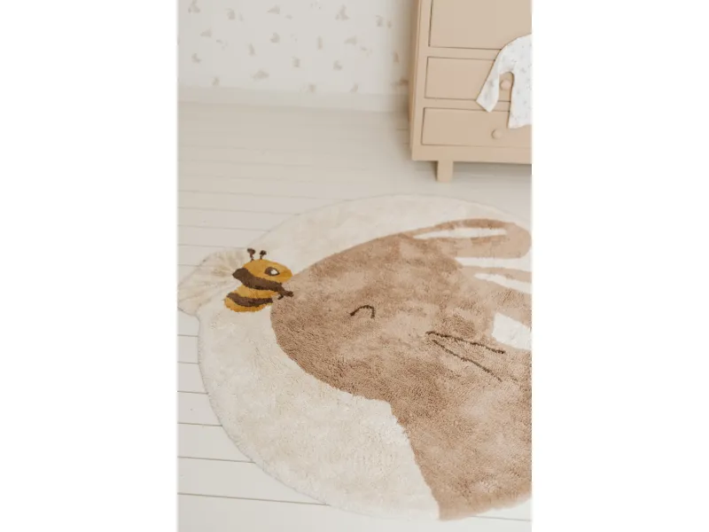 Tento nežný koberec v tvare zajačika dodá detskej izbe teplo, jemnosť a hravý prírodný nádych. Vďaka mäkkej organickej bavlne je príjemný na dotyk a vytvára pohodlné miesto na hranie, čítanie aj oddych. Neutrálny béžový odtieň ľahko zapadne do každého interiéru a milý detail včielky na ňufáku dodá izbičke rozkošný akcent.