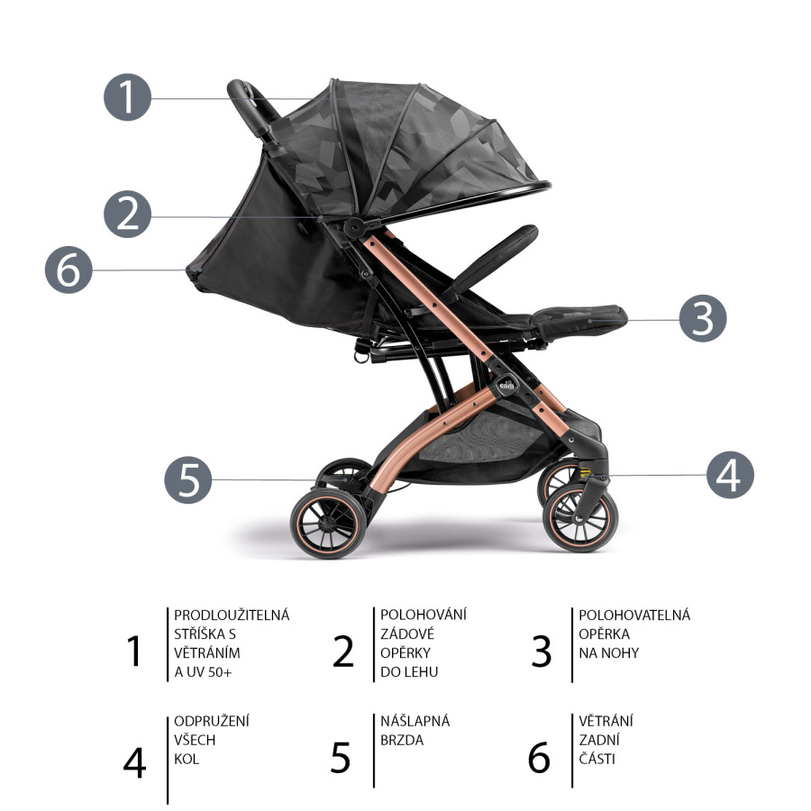 Opierku chrbta možno sklopiť do polohy ležmo a nastaviteľná je aj opierka nôh. Počas letných dní príde vhod rozťahovacia strieška s vetraním a ochranou proti slnku UV 50+. Priestor medzi strieškou a operadlom je tiež vetraný.
