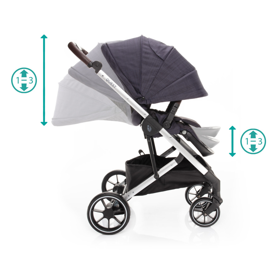 Ďalšou novinkou modelu QUEST je možnosť jednoduchého nastavenia výšky rukoväte pomocou bezpečnostného zámku. Pohodlnú a nerušenú jazdu aj v náročnom teréne zaručuje odpruženie všetkých 4 gumených kolies v novom dizajne. Sú rovnako mäkké ako nafukovacie, ale zároveň sú bezúdržbové. Preto nehrozí riziko prepichnutia. Pohodlnú jazdu s modelom QUEST zabezpečuje nielen kvalitné odpruženie, ale aj dostatočná veľkosť kolies. Preto má kočík predné kolesá s priemerom 7 palcov a zadné kolesá s priemerom 9 palcov.