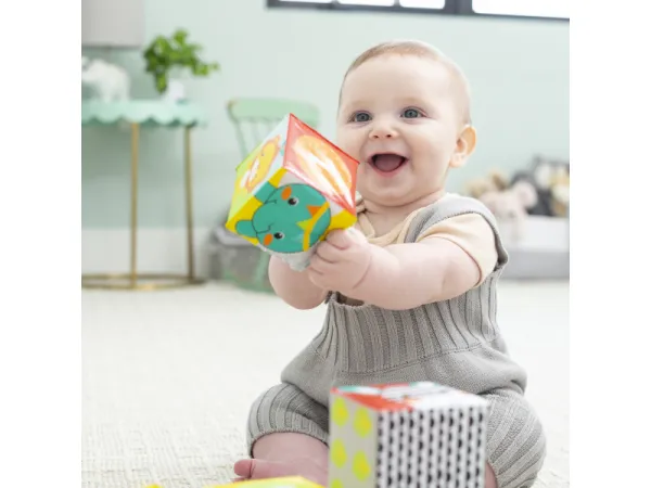 Omyvatelné kostky s krásnými ilustracemi zvířátek ve výrazných kontrastních barvách jsou vhodné pro použití ve vaně i jako první kostky pro stavění věží a společné vyprávění o zvířátkách, barvách i číslech.