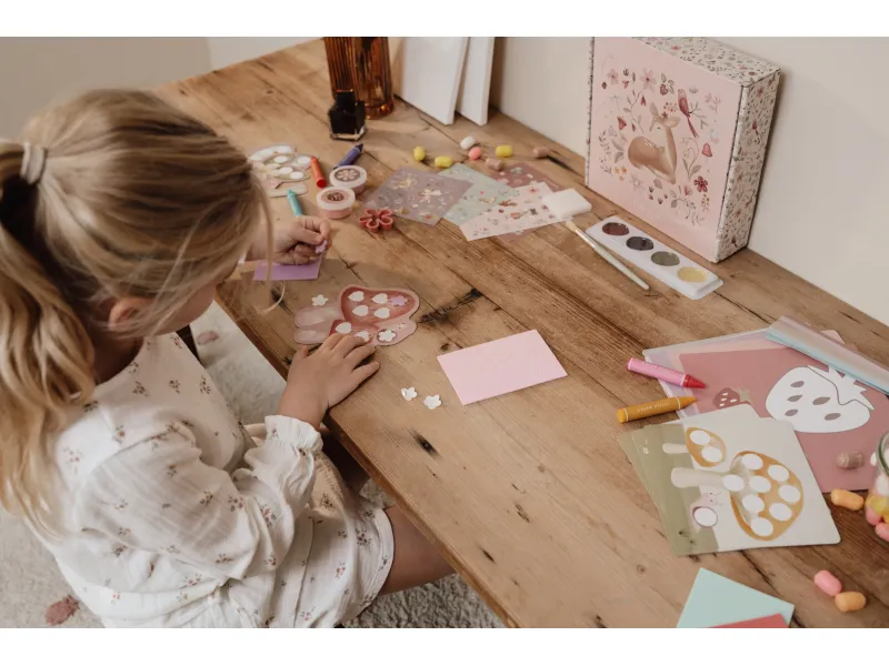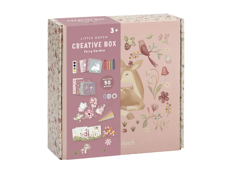Kreatívna sada Little Dutch Fairy Garden prinesie deťom svet rozprávok a zábavného tvorenia. Obsahuje všetko potrebné – pastelky, vodovky, plastelínu, samolepky a ďalšie pomôcky, ktoré podnecujú fantáziu a rozvíjajú jemnú motoriku. Všetko je uložené v krásnom boxe s motívom záhradných víl, do ktorého si deti po hre všetko jednoducho upracú.