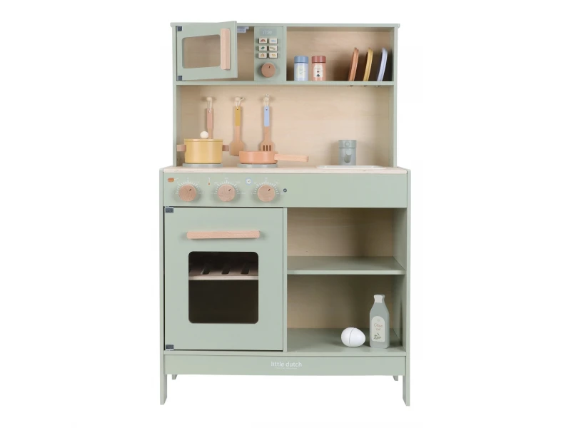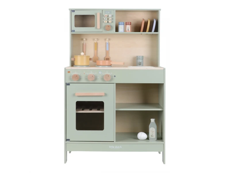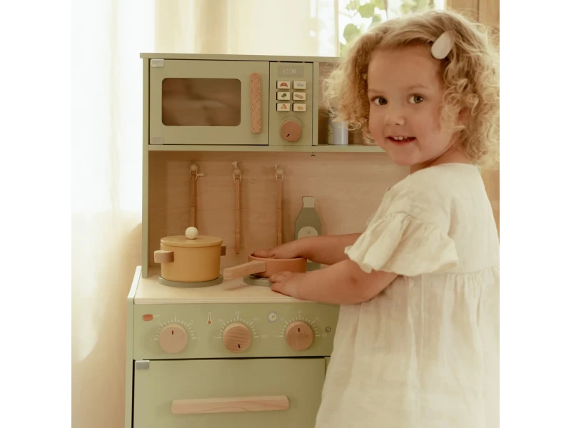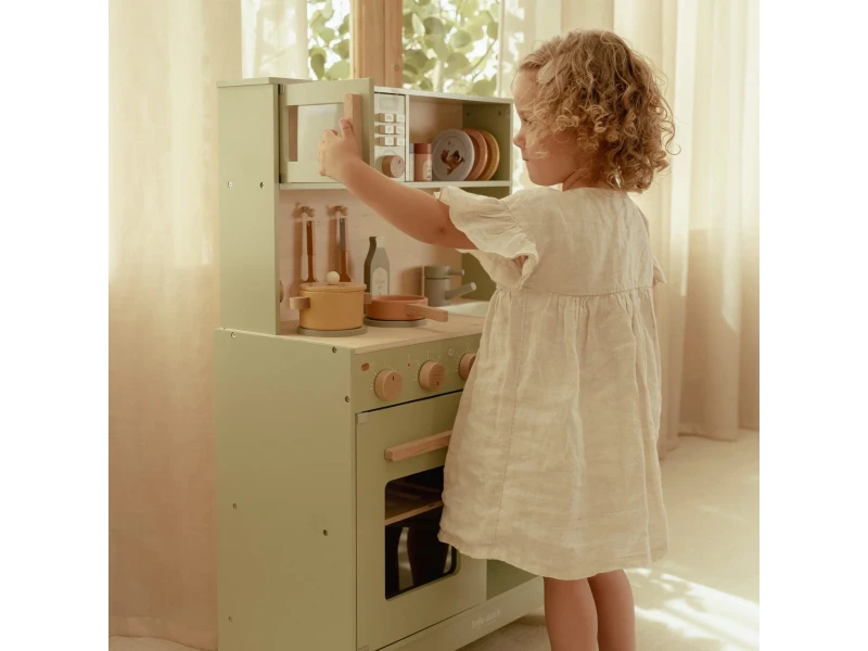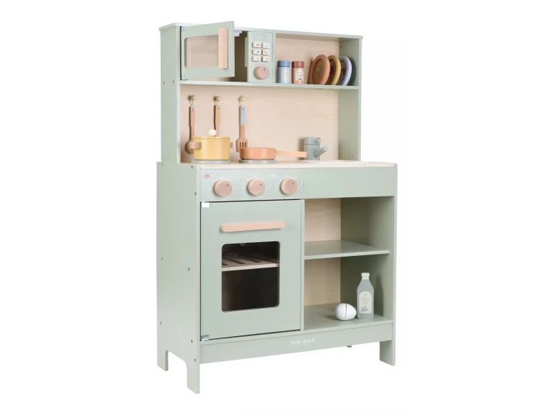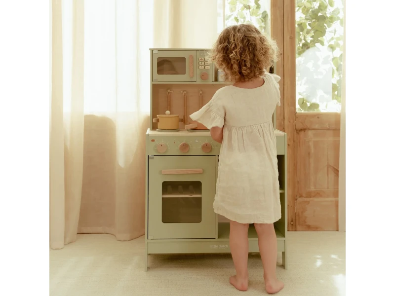 Drevená kuchynka Little Dutch Mint ponúka deťom autentický zážitok z varenia a pečenia. S bohatou výbavou doplnkov sa malý kuchár či kuchárka môže naplno ponoriť do tvorby receptov pre bábiky, plyšákov alebo celú rodinu. Sporák, rúra aj mikrovlnka umožnia pripraviť viac chodov naraz a drevený drez učí deti o dôležitosti upratovania po varení.