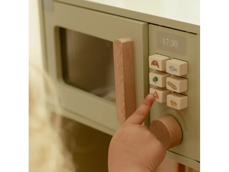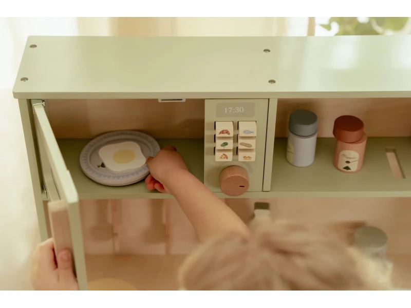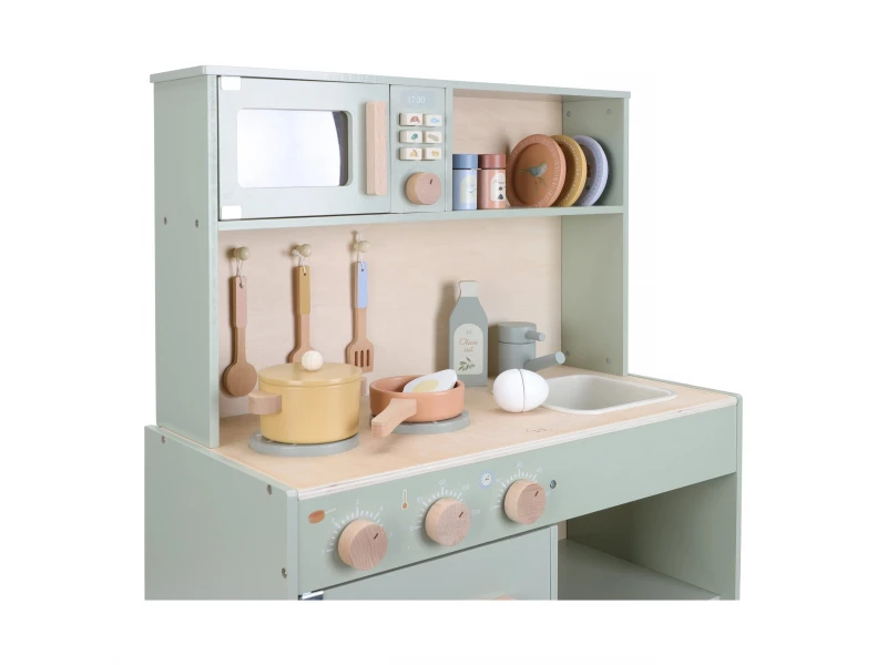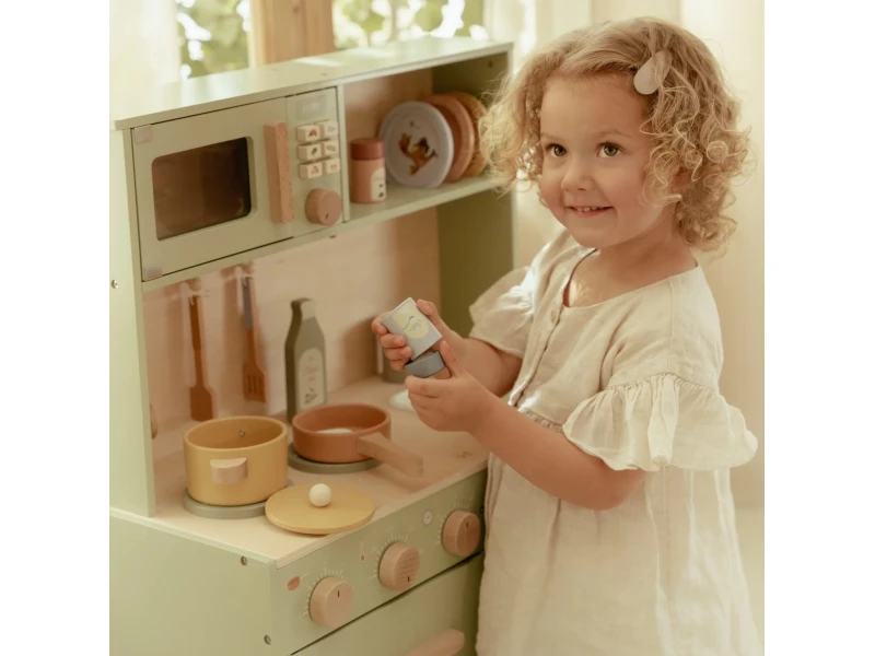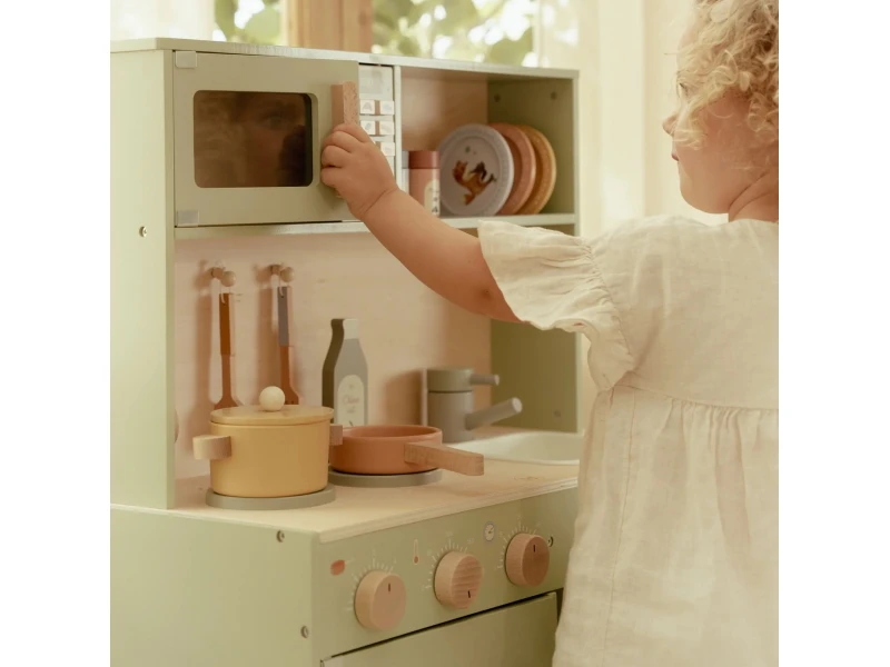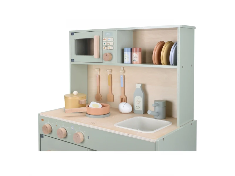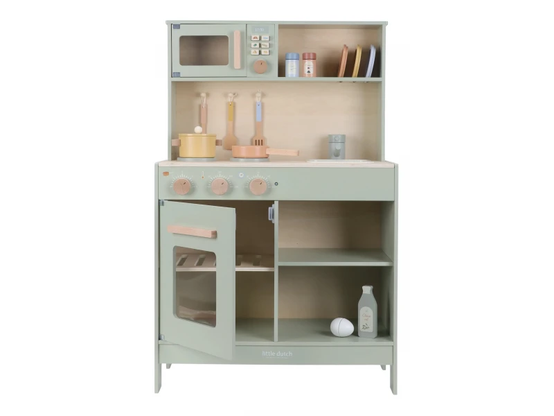 Drevená kuchynka Little Dutch Mint ponúka deťom autentický zážitok z varenia a pečenia. S bohatou výbavou doplnkov sa malý kuchár či kuchárka môže naplno ponoriť do tvorby receptov pre bábiky, plyšákov alebo celú rodinu. Sporák, rúra aj mikrovlnka umožnia pripraviť viac chodov naraz a drevený drez učí deti o dôležitosti upratovania po varení.