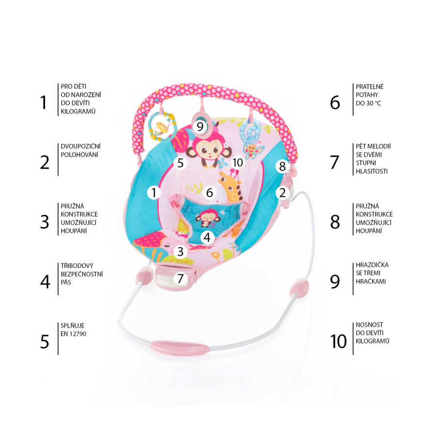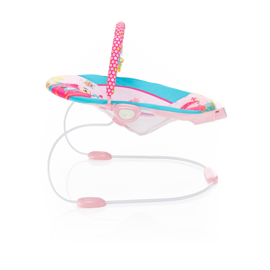 Lehátko Happy ponúkne vášmu drobčekovi veľa nových podnetov, preto si ju určite obľúbi. Jej nosným prvkom je pružná konštrukcia, ktorú si dieťatko svojimi pohybmi samo „rozhúpe“. Kým 3bodový bezpečnostný pás a protišmykové nožičky zaistí jeho bezpečnosť. Pozornosť dieťaťa v lehačce upúta tiež pekná hrazdička s 3 umývateľnými hračkami, ktoré rozvíjajú detské zmysly a jemnú motoriku. 2-stupňové polohovanie potom vášmu miláčikovi poskytne príjemné posedenie a ten najlepší rozhľad.