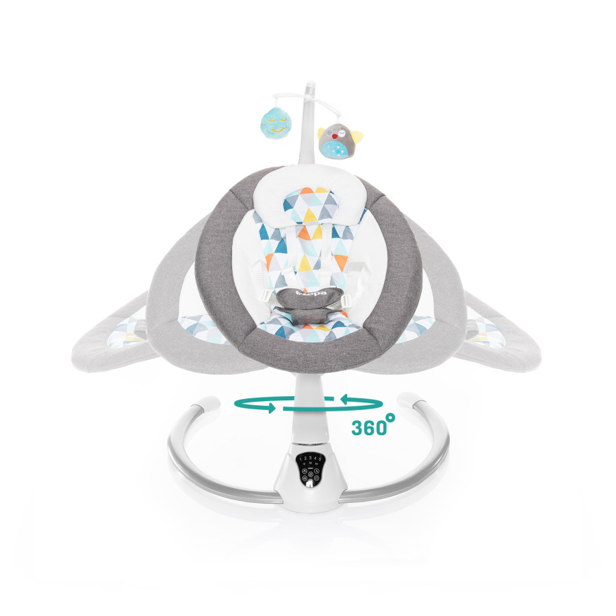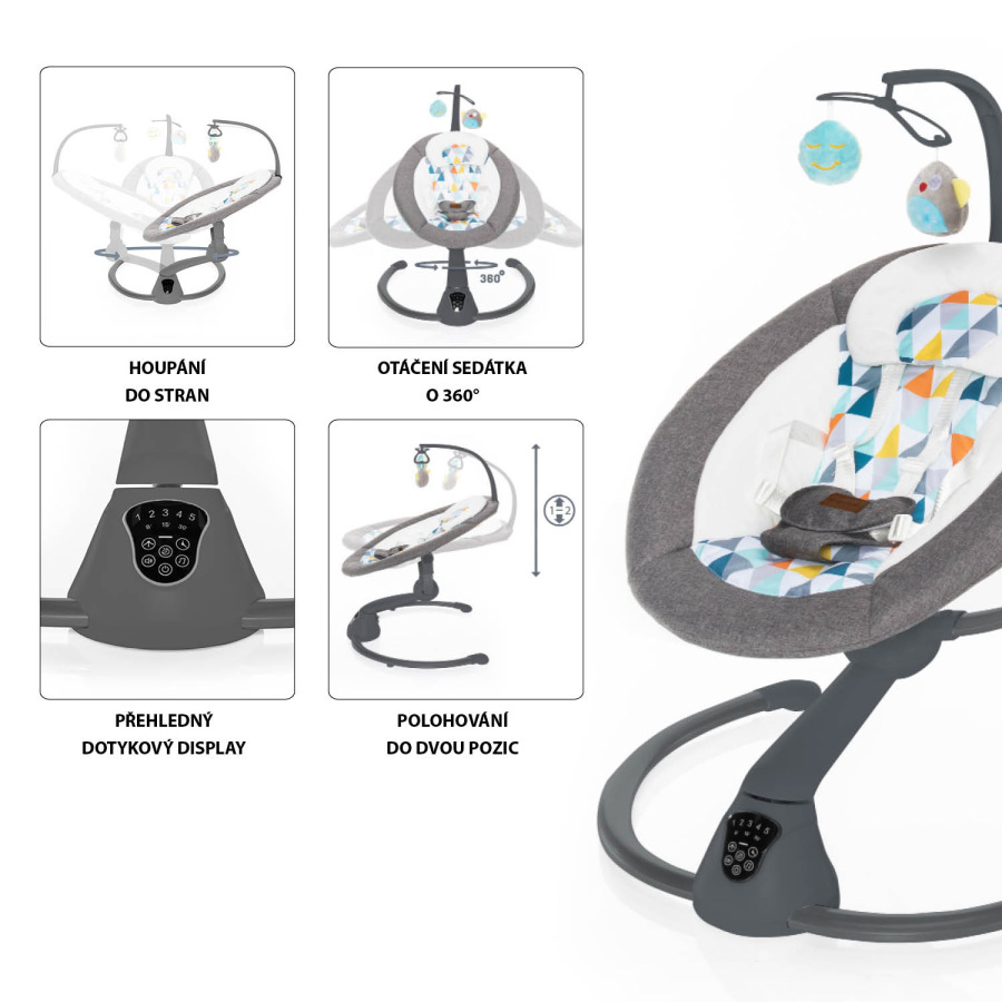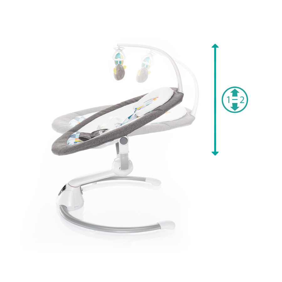 Otáčanie o 360°, 5 úrovní intenzity hojdania, automatické zapnutie, nastaviteľný čas hojdania, dotykový ovládací panel, diaľkové ovládanie, hrazda s hračkami, 5-bodový bezpečnostný pás, zvuky na upokojenie - to je multifunkčné lehátko Lullaby. Vhodné pre deti od narodenia do 9 kg.