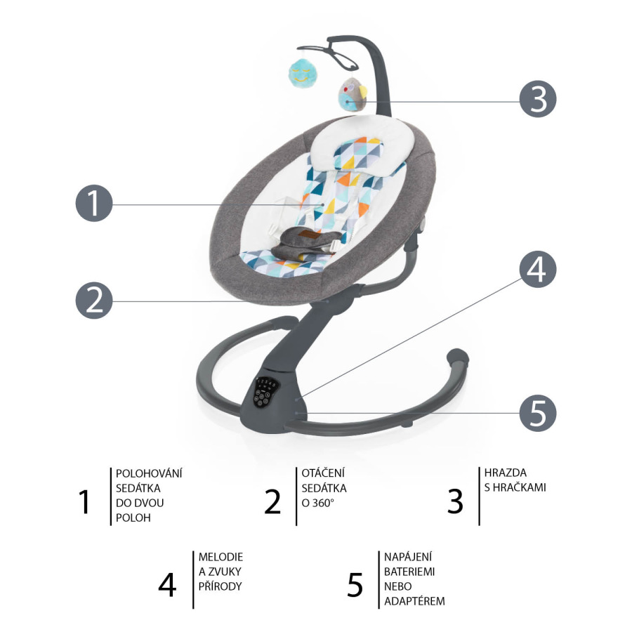 nahrádza hojdanie v ramenách. Lehátko má 5 úrovní intenzity hojdania a
