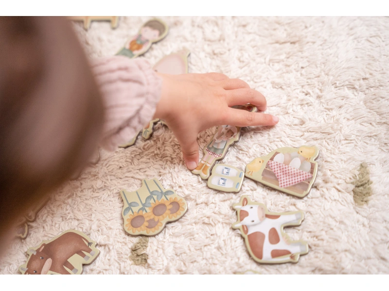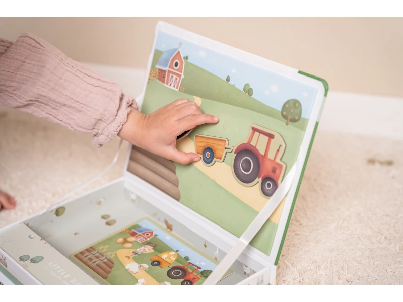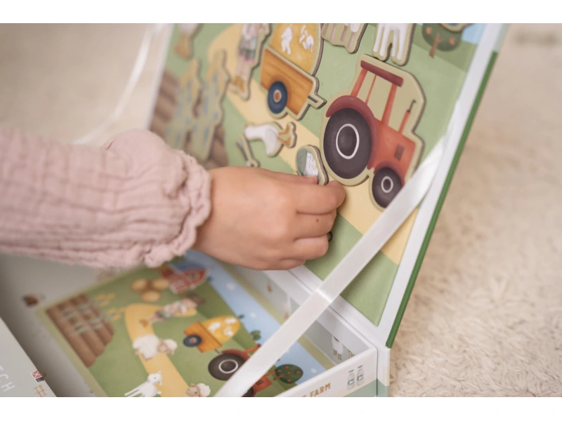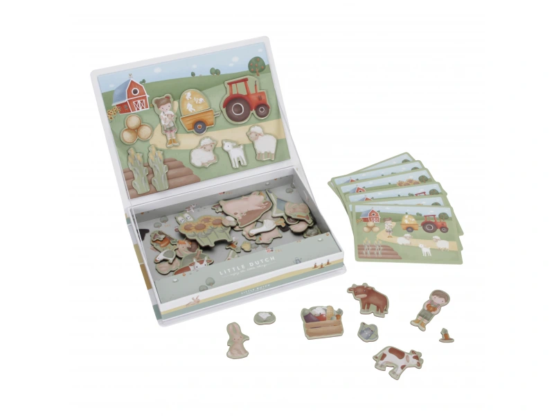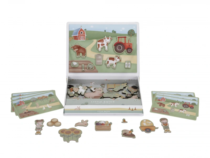 Magnetická hra sa skladá z magnetických dielov s motívmi zo života na farme a 6 vzorových kariet. Magnetické veko je možné použiť ako hernú dosku.
