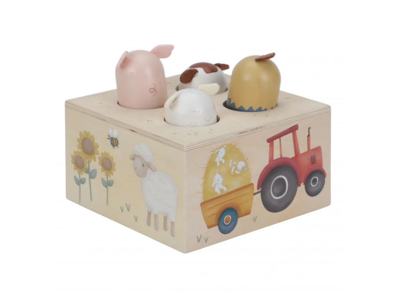 Zábavná a originálna hračka so zvieratkami z farmy bude baviť deti aj vás! Zatlačením na hlavičku zvieratka jedno zasuniete a druhé vyskočí, zároveň budete počuť zvuky, ktoré prasiatko, ovečka, kravička a sliepočka vydávajú.
