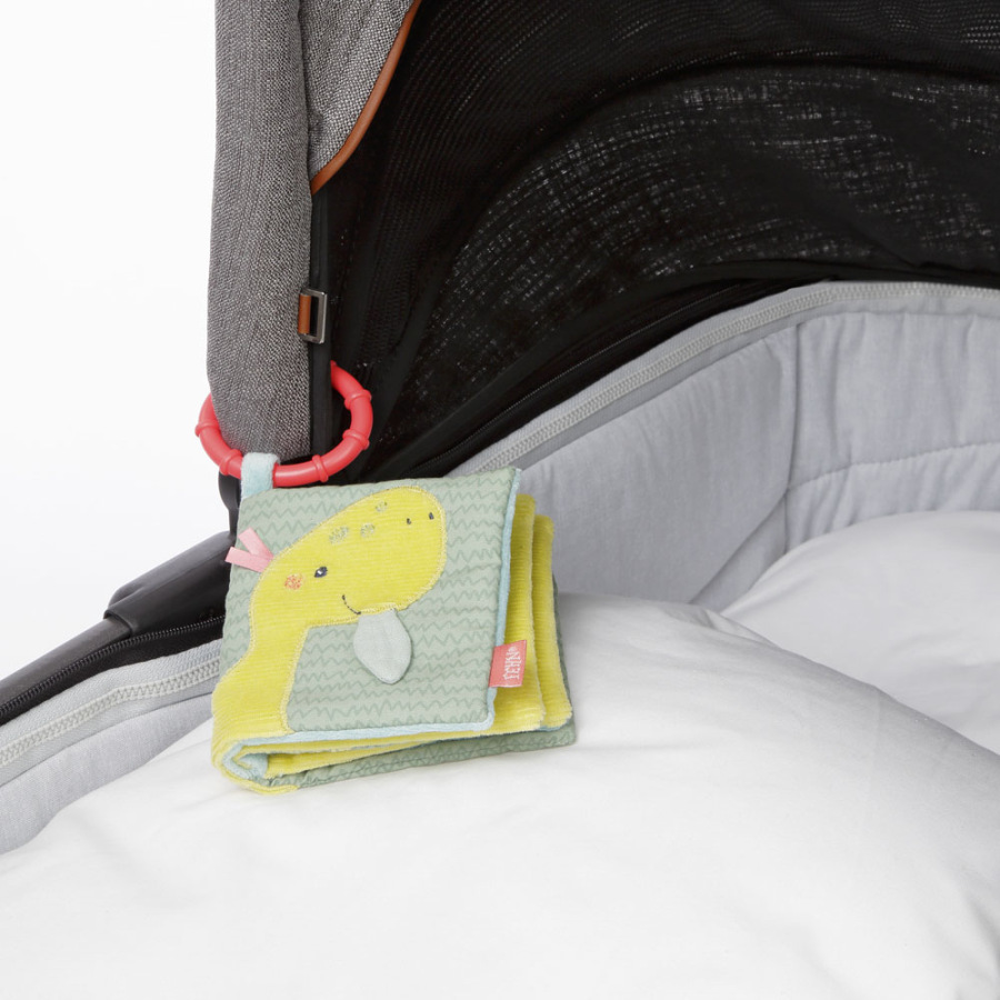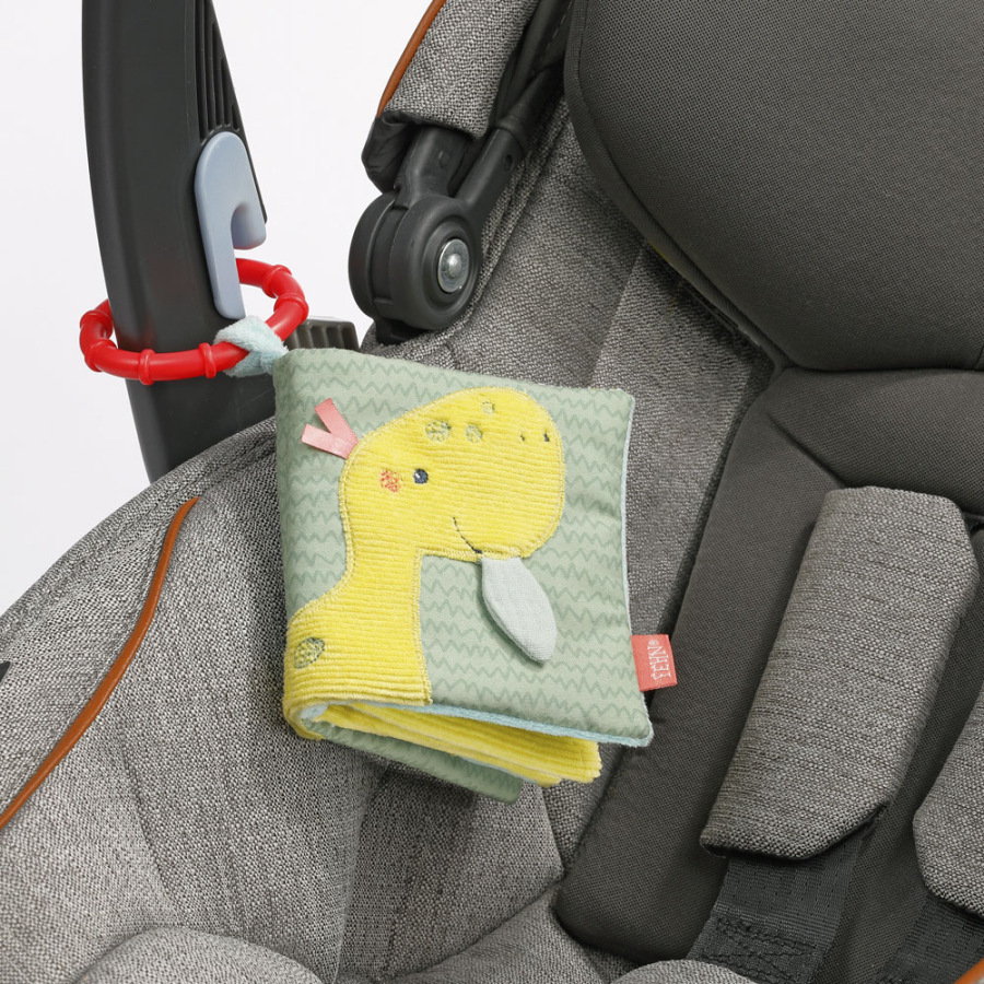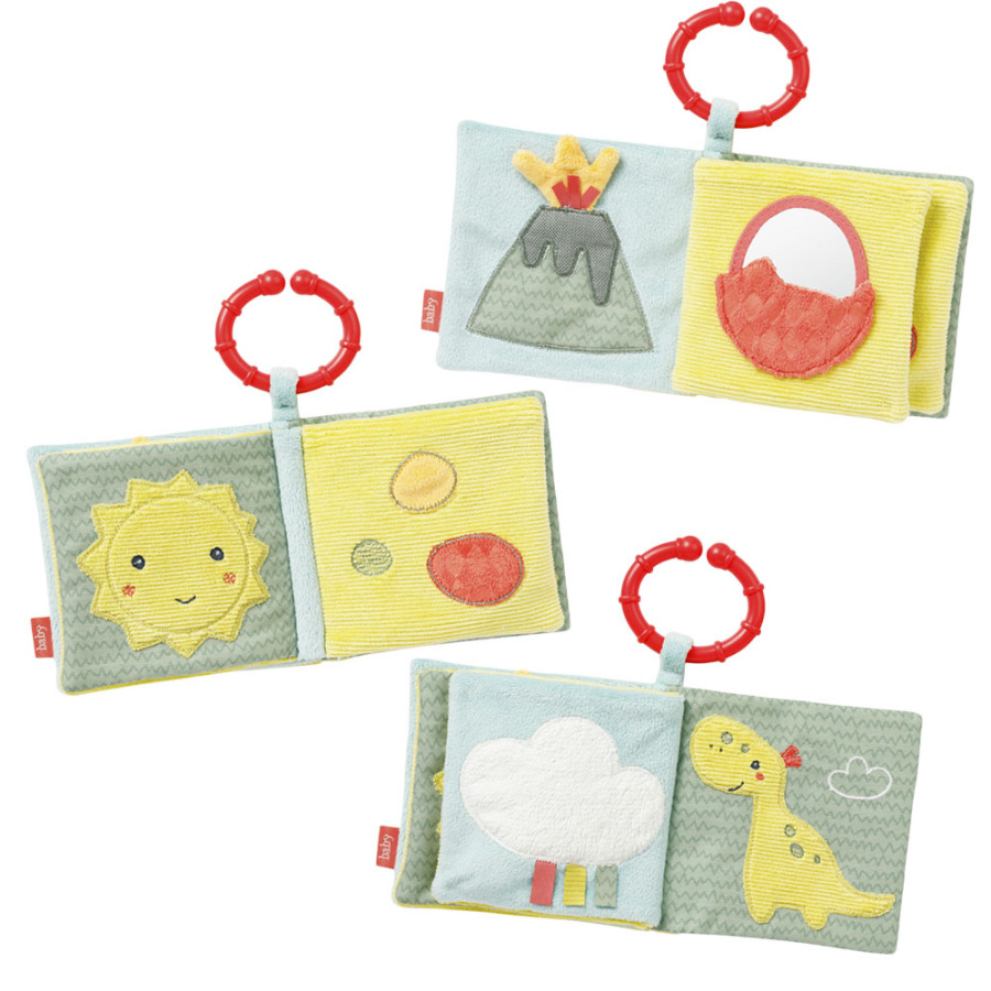 S látkovou plyšovou knižkou môžu deti na 8 stranách oživiť roztomilé praveké stvorenia. Každá stránka má rôzne zábavné efekty ako sú pískadlo , šuštiaci papier, plyšové vajíčka či zrkadlo . Knižka rozvíja úchop, hmat, fantáziu a jemnú motoriku . Praktický upevňovací krúžok dovoľuje ľahké pripevnenie na postieľku, kočíku alebo autosedačku.