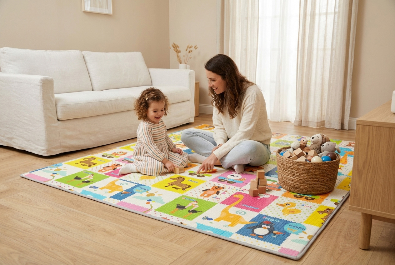 Mäkká, no zároveň dostatočne pevná pena chráni dieťa pred tvrdou podlahou a tlmí nárazy pri pádoch. Podložka vytvára ideálny priestor na lezenie, hranie aj oddych.