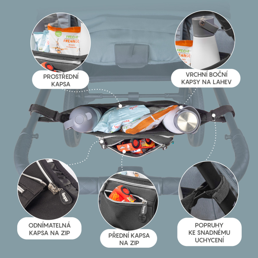 - Vďaka pásikom na suché zipsy je možné upevniť k väčšine kočíkov