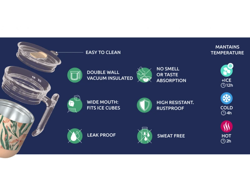 • Dvojstenná oceľ udrží studené nápoje až 4 hodiny a s ľadom až 12 hodín.